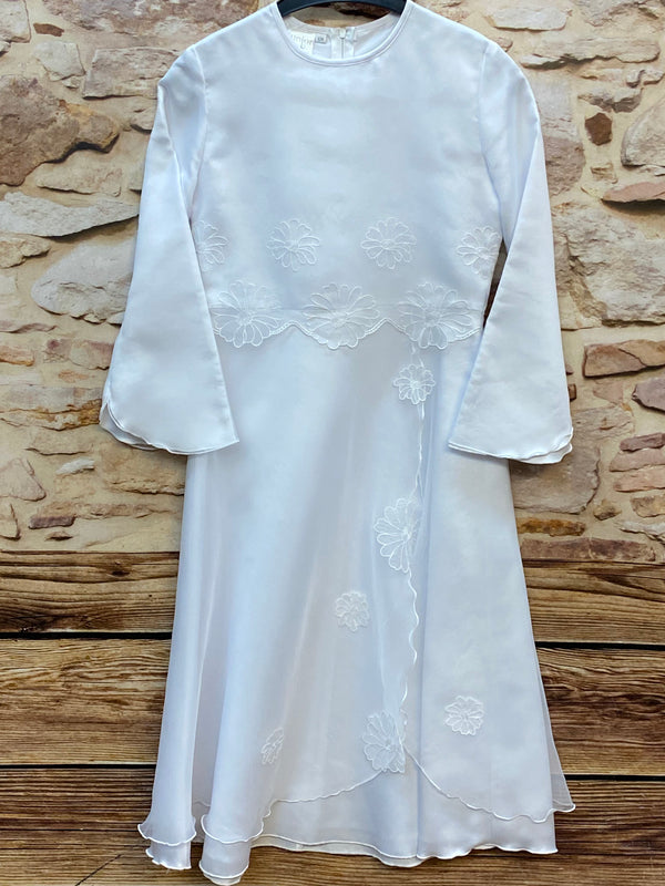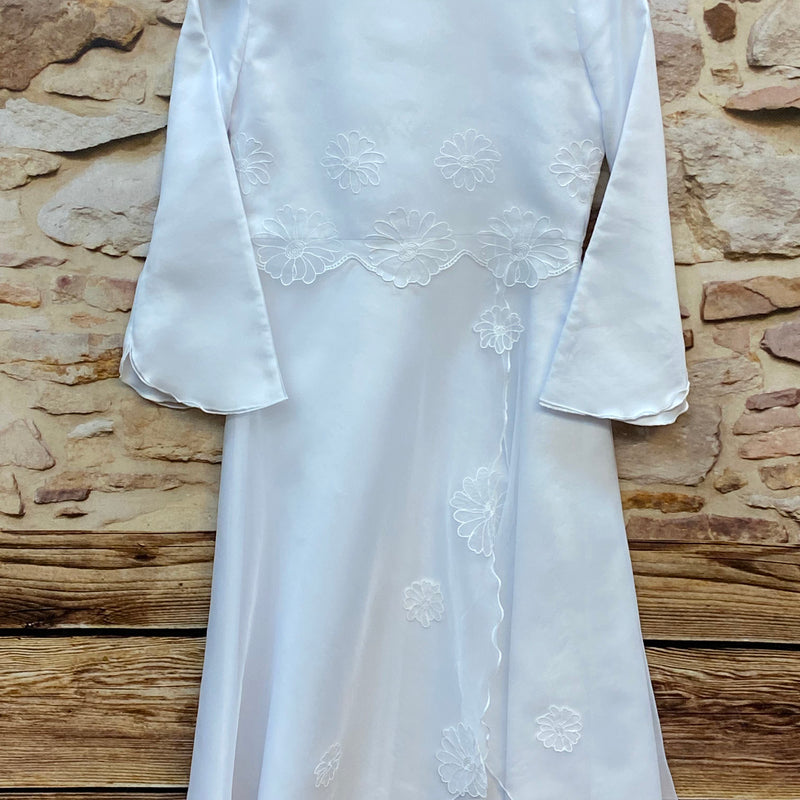 Elegantes weißes Festkleid für Mädchen in zart fließender Ausführung — ideal für Hochzeiten, Kommunion oder andere feierliche Anlässe. Das Kleid besticht durch seine schlichte, edle Linienführung und die feinen floralen Stickereien, die dem Design eine romantische Note verleihen.