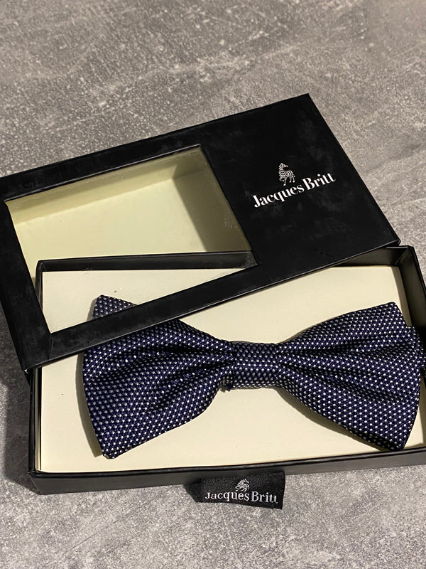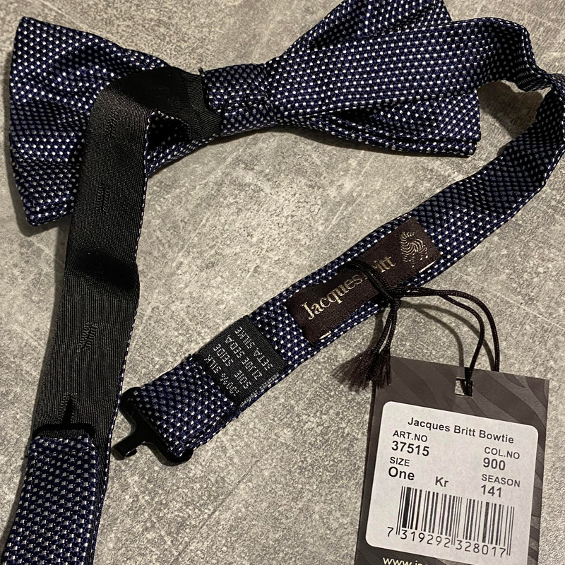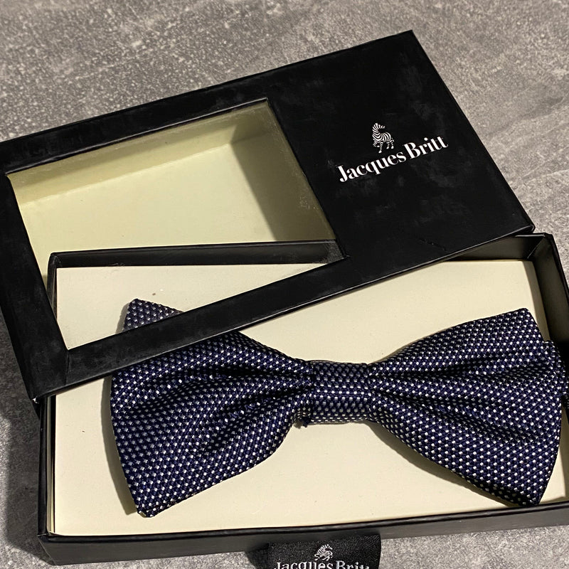 Diese elegante Jacques-Britt-Fliege aus reiner Seide überzeugt mit einem feinen dunkelblauen Micro-Muster, das sowohl modern als auch klassisch wirkt. Die hochwertige Verarbeitung, der verstellbare Verschluss und die original Jacques-Britt-Verpackung machen sie zu einem idealen Accessoire für Hochzeiten, Business-Anlässe, festliche Events oder den stilvollen Abendlook.Neu, ungetragen, inklusive Originalverpackung und Etikett.