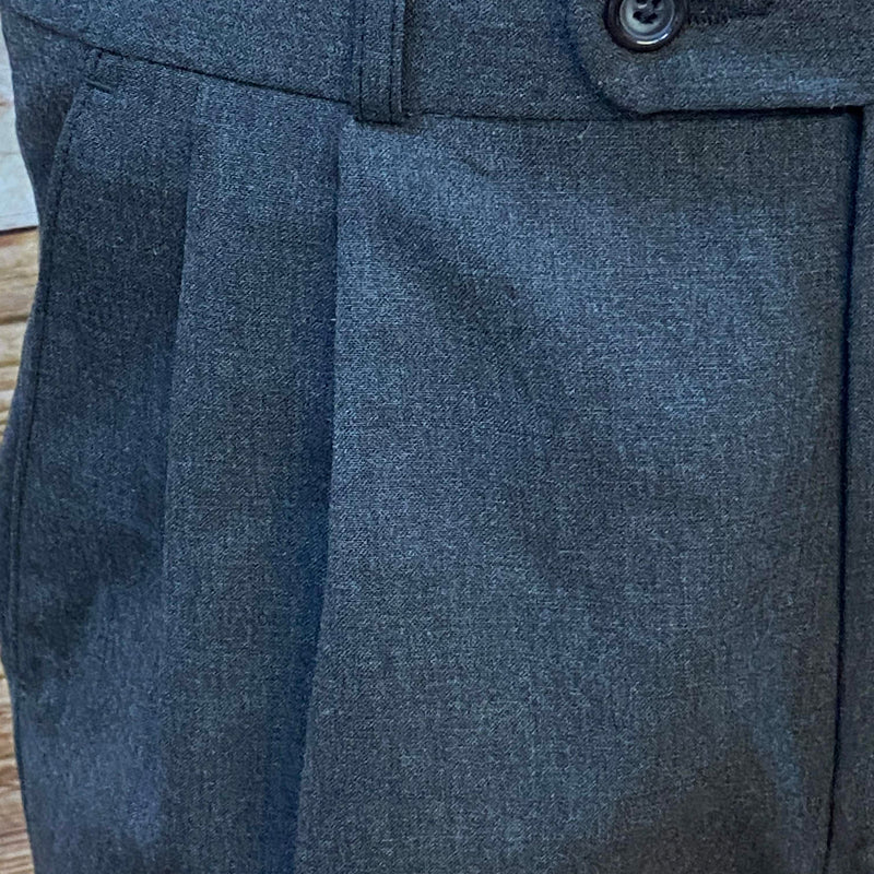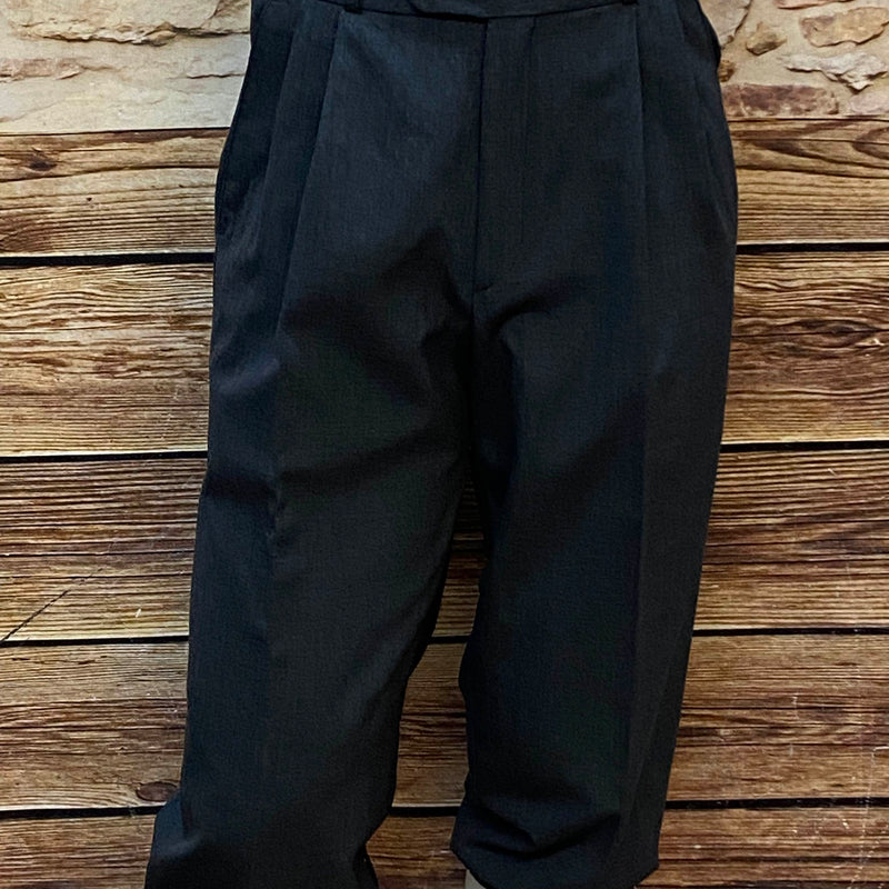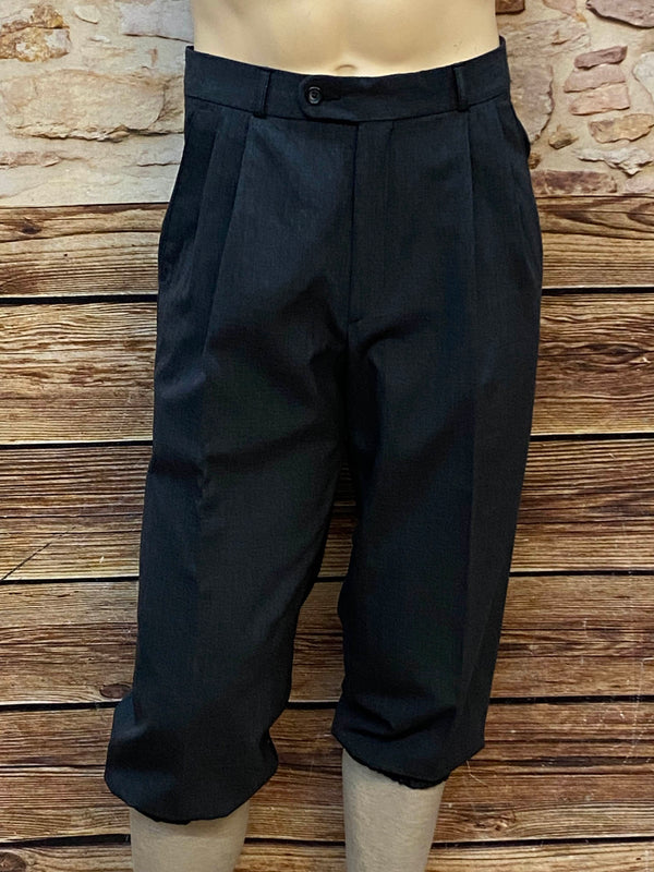 Diese klassische Herren-Knickebocker im Stil der 1920er Jahre besticht durch ihre zeitlose Silhouette und hochwertige Verarbeitung. Die Hose besteht aus reiner Schurwolle, was man am typischen Wollsiegeletikett erkennt. Der dunkle Anthrazitton verleiht ihr einen eleganten, authentischen Look.