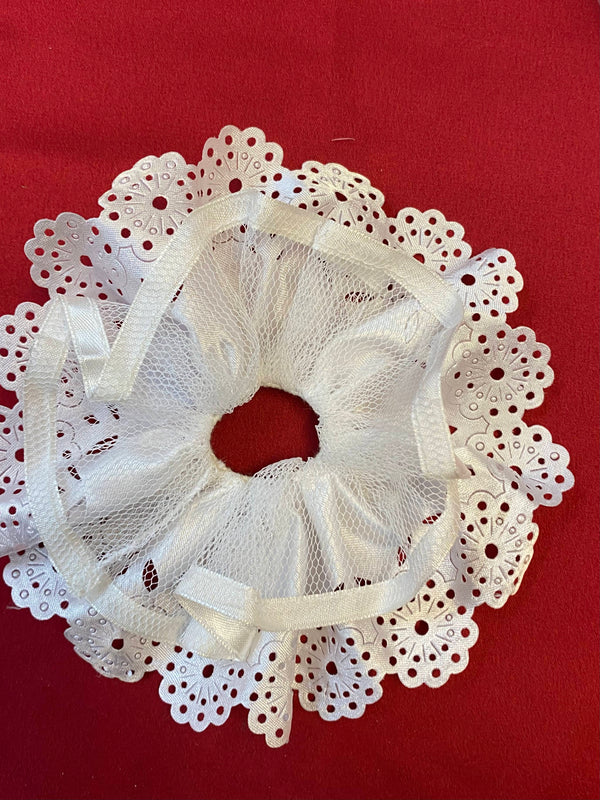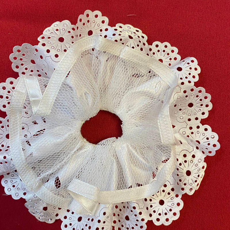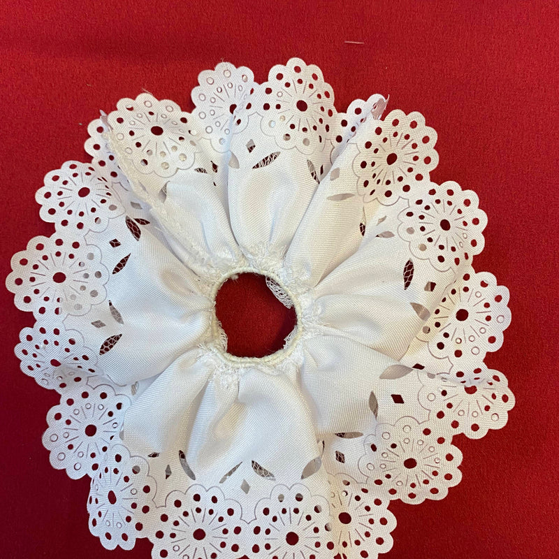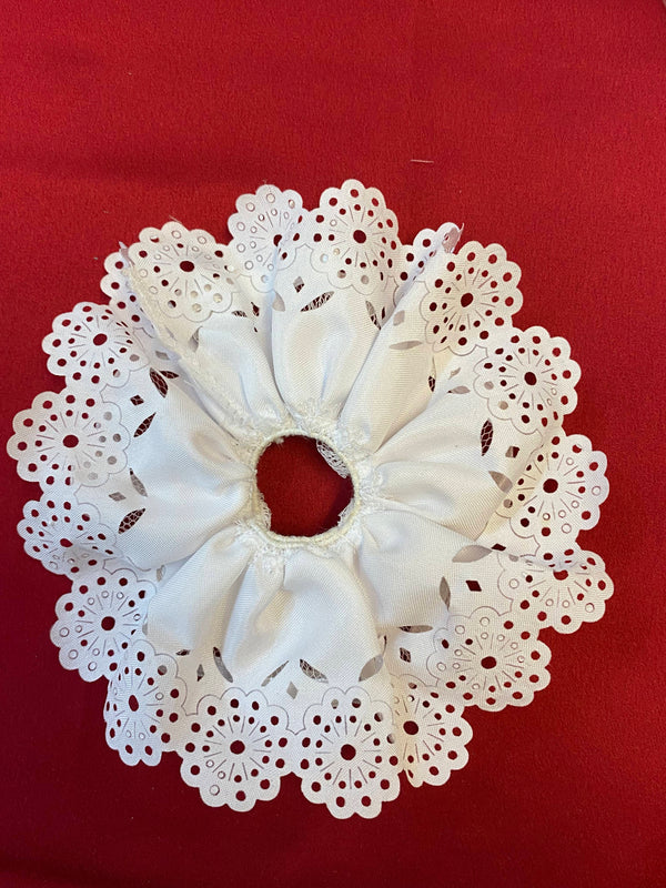 Diese Kerzenmanschette für Kommunionkerzen ist eine klassische und elegante Dekoration für eine Kommunionkerze. Sie besteht aus weißem Stoff mit feinem Tüll und dekorativer Spitze.