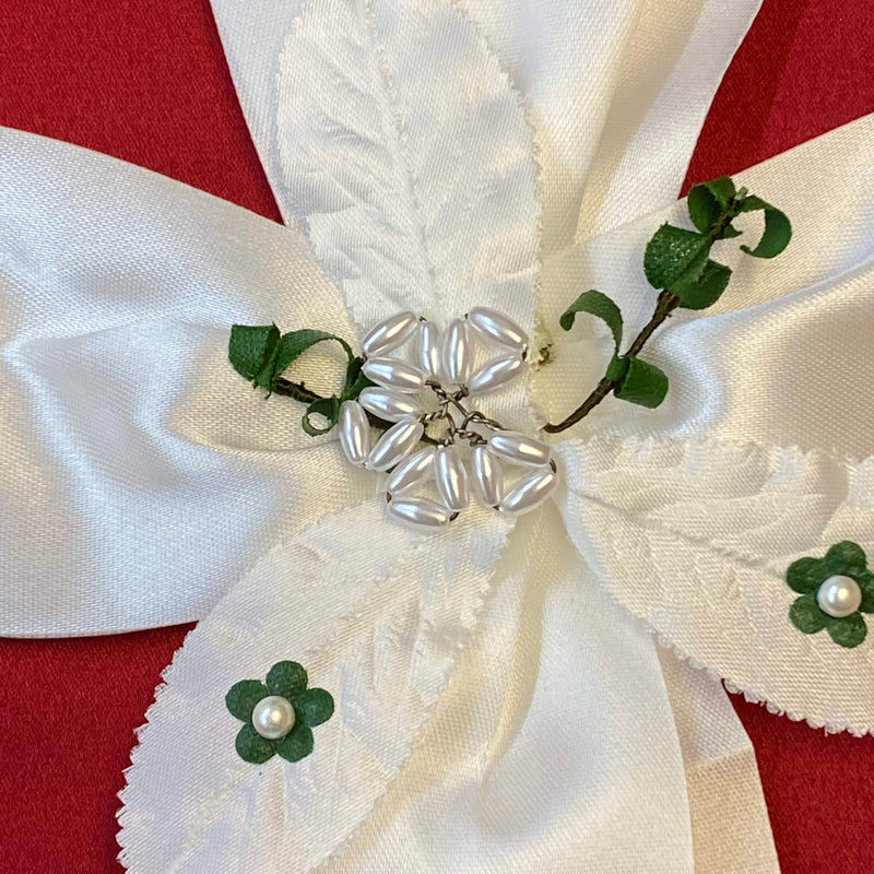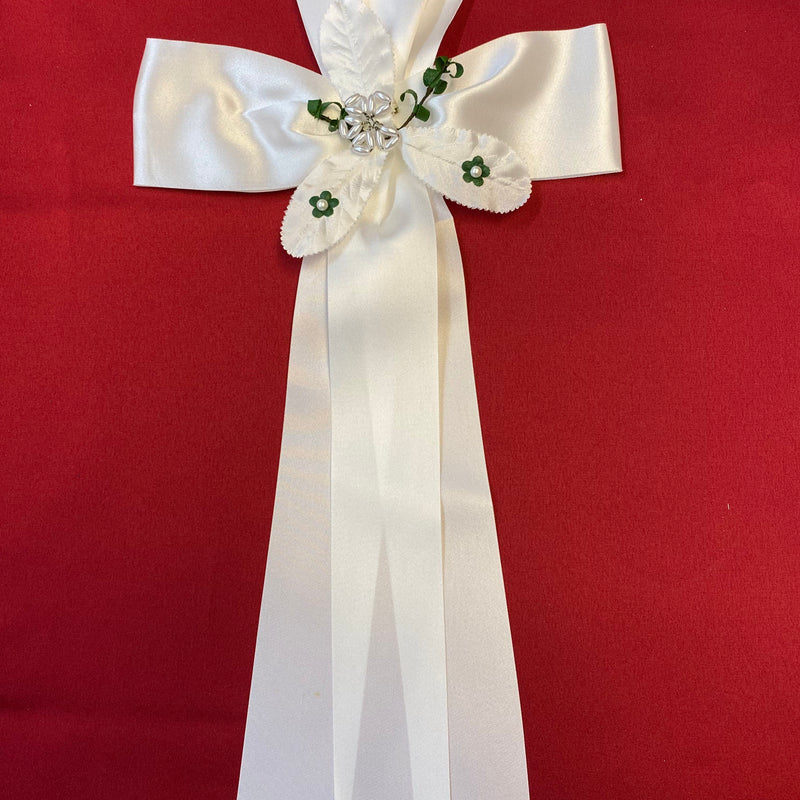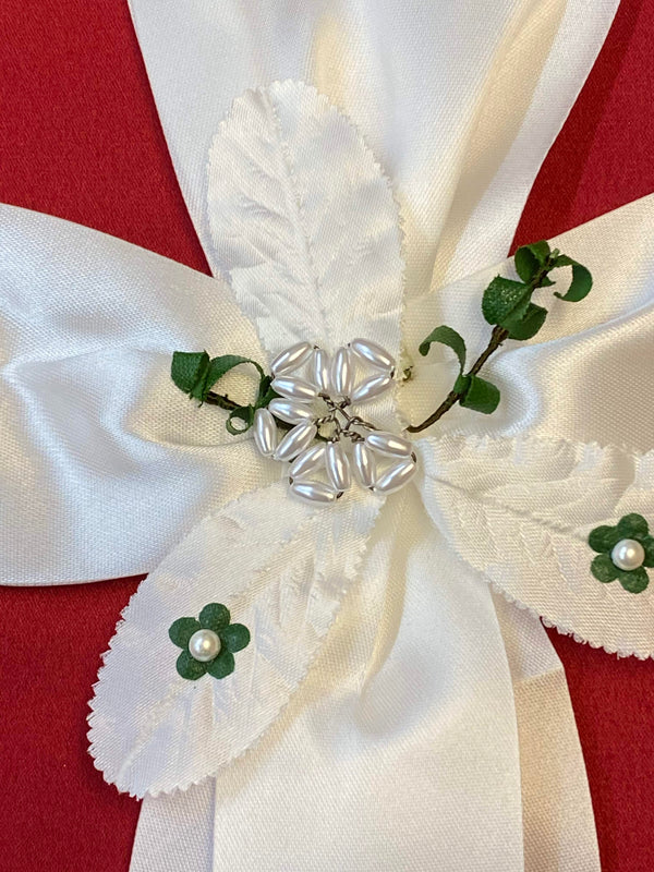 Diese festliche Kerzenschleife zur Erstkommunion ist eine elegante Dekoration für Kommunionkerzen. Die große Schleife besteht aus weißem Satinband und wird durch eine dekorative Perlenblume mit Blättern und kleinen grünen Blüten verziert.
