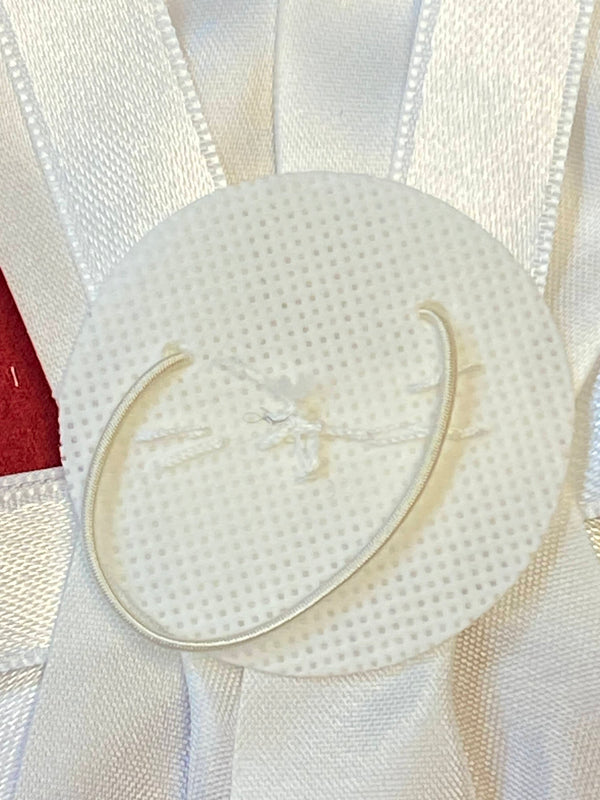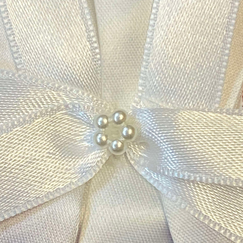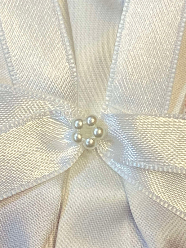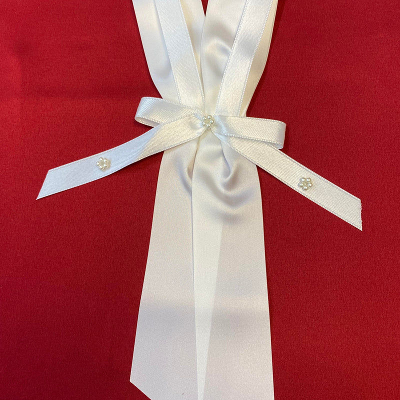 Diese schlichte und elegante Kerzenschleife zur Erstkommunion ist eine schöne Dekoration für Kommunionkerzen. Die Schleife besteht aus weißem Satinband und wird durch kleine Perlendetails dekorativ ergänzt.
