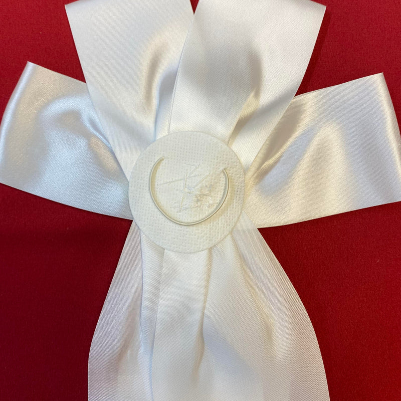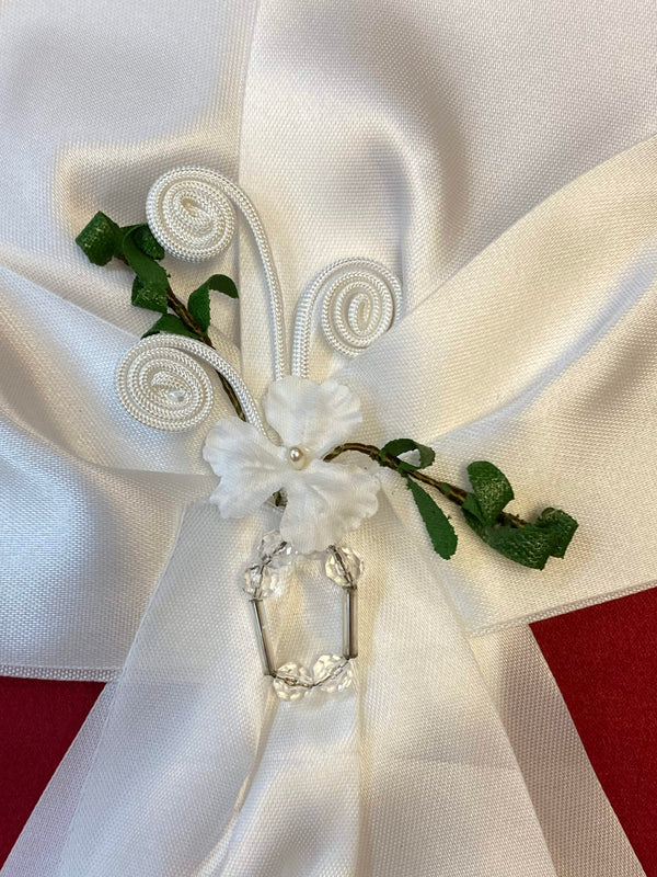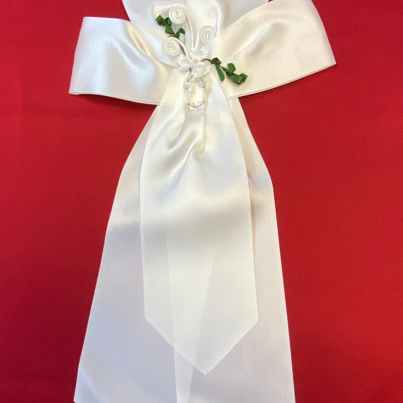 Diese Schleife ist eine stilvolle Ergänzung für die Kommunionkerze und das Kommunion-Outfit und passt besonders gut zu klassischen weißen Kommunionkleidern.