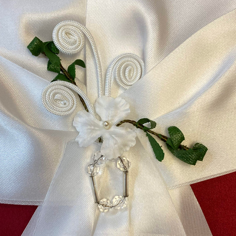 Diese festliche Kerzenschleife für die Erstkommunion ist eine schöne Dekoration für die Kommunionkerze. Die Schleife besteht aus breitem weißen Satinband und ist mit zarten Dekorationselementen aus Perlen, Kristallen und Blüten gestaltet.