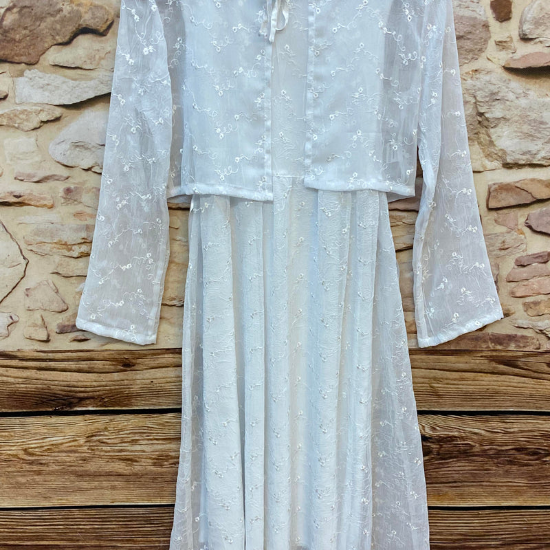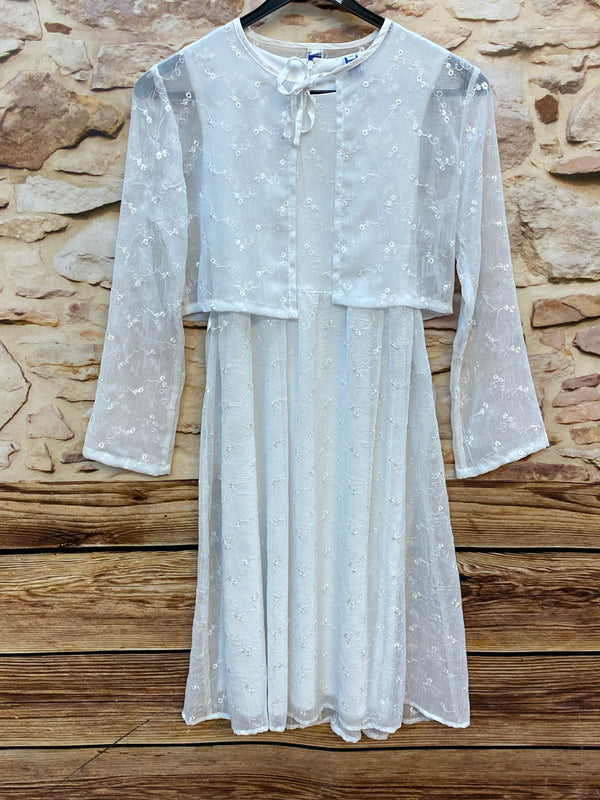 Sehr elegantes, festliches 2-teiliges Kommunion- und Anlasskleid in strahlendem Weiß. Das Set besteht aus einem schlichten Unterkleid und einem zarten, transparenten Spitzenüberkleid mit dekorativer Bolero-Optik.