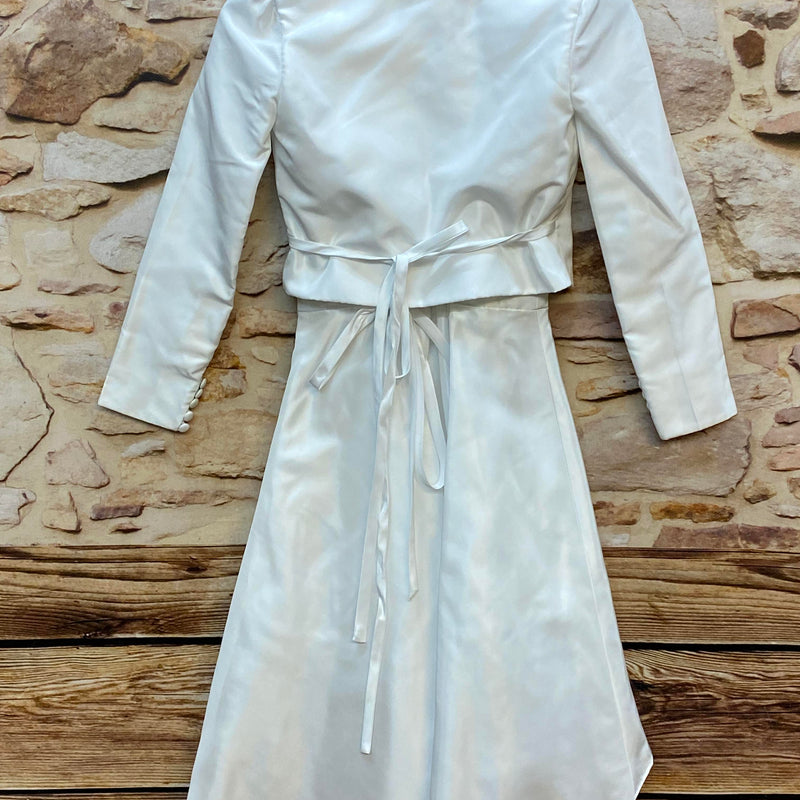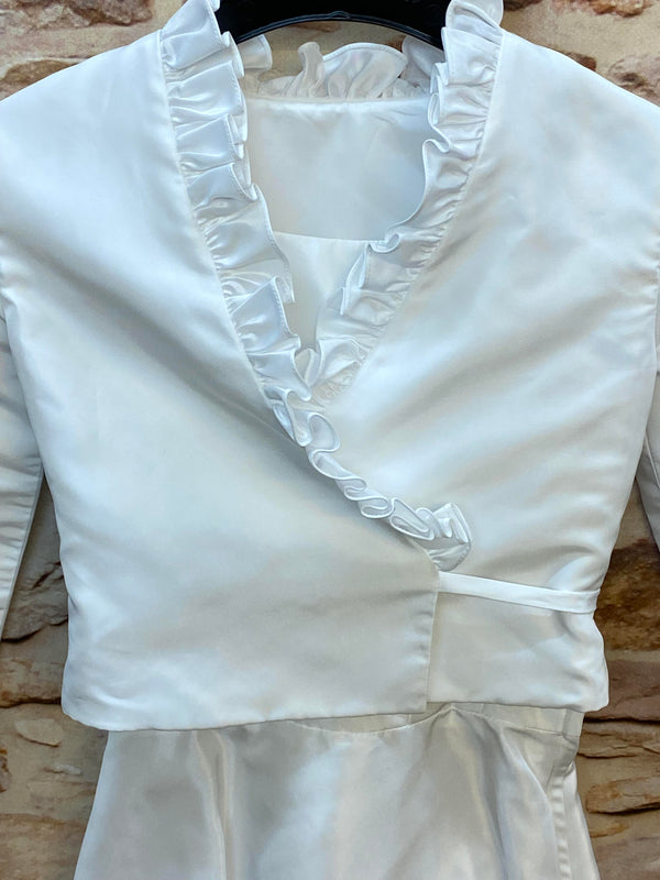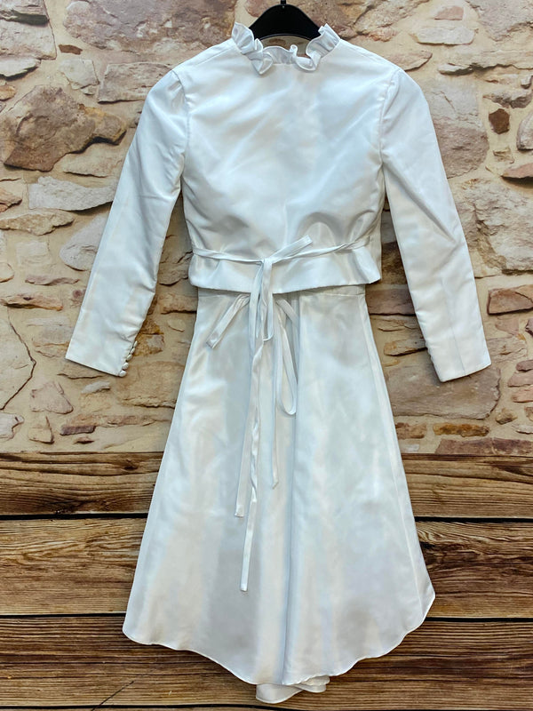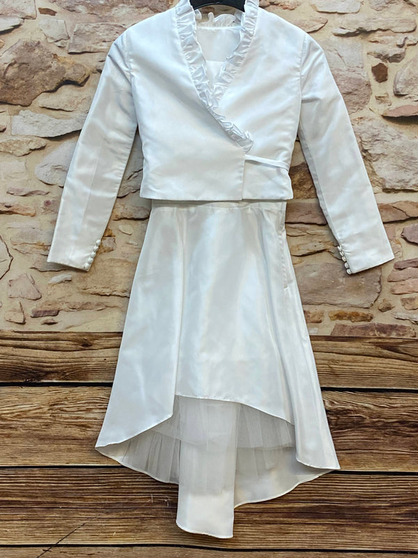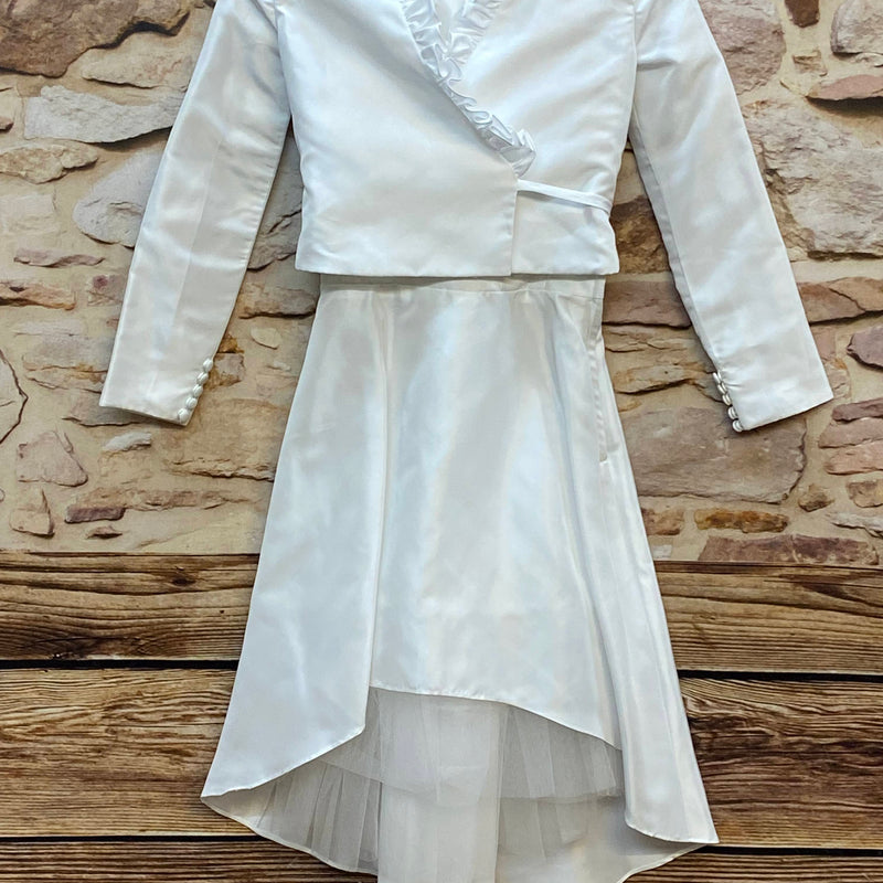 Wunderschönes festliches Kommunionkleid für Mädchen in klassischem Weiß mit passendem Bolero. Das Kleid besticht durch seinen modernen Vokuhila-Schnitt — vorne kürzer, hinten länger — sowie einen zarten Tüllunterrock, der dem Rock schönes Volumen verleiht.