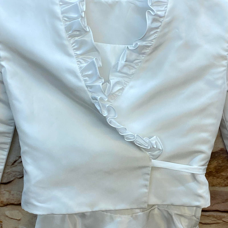 Der elegante Bolero mit Rüschen am Ausschnitt und dekorativen Knöpfen an den Ärmeln rundet den Look perfekt ab. Durch das ärmellose Kleid kann das Set auch ohne Bolero getragen werden — ideal für unterschiedliche Temperaturen am Festtag.