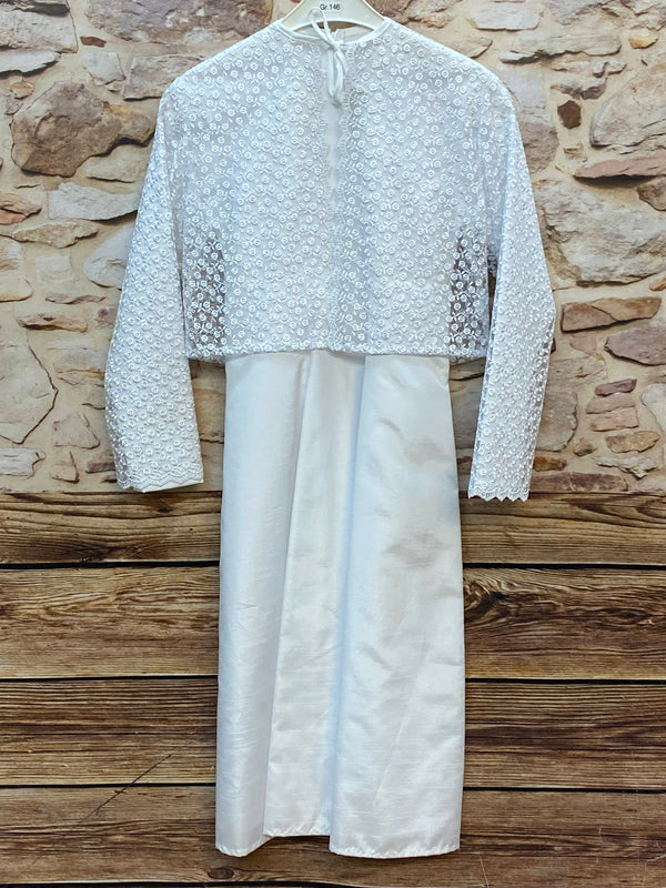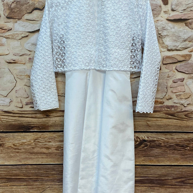 Elegantes zweiteiliges Kommunion-Set in klassischem Weiß bestehend aus einem schlichten langen Kleid und einem zarten Spitzen-Bolero.