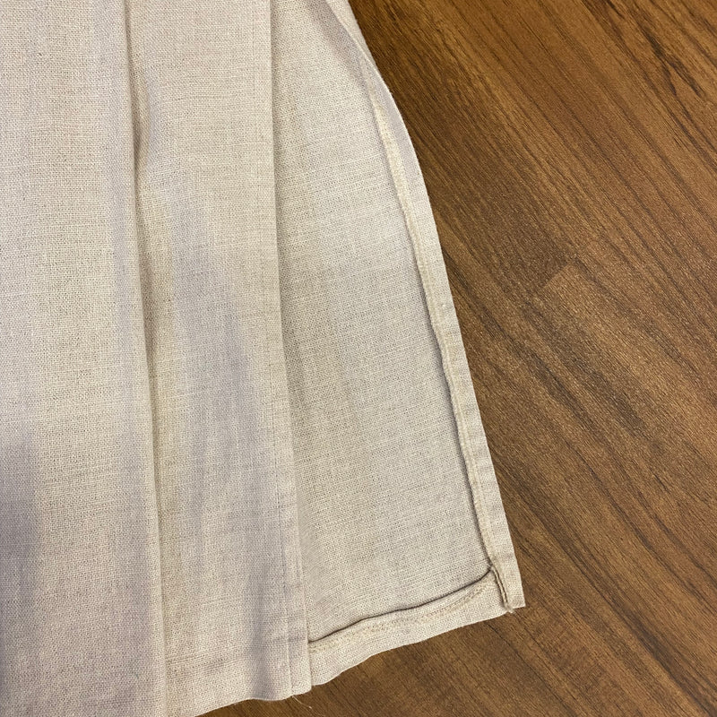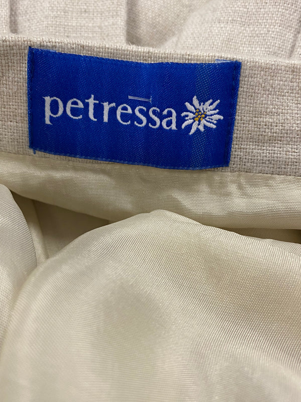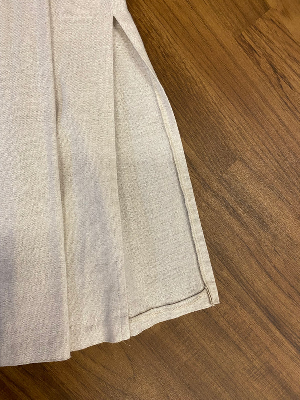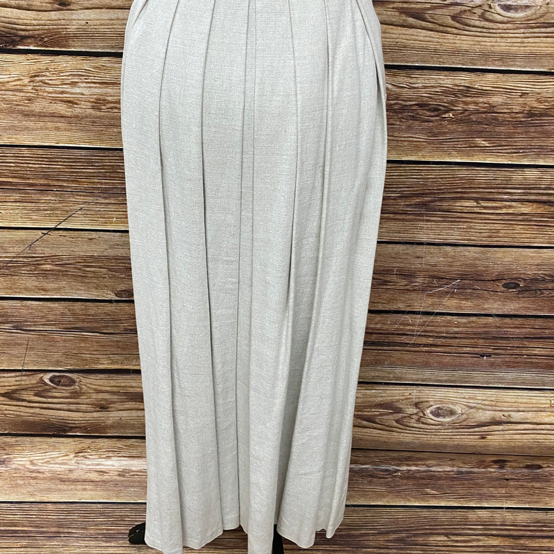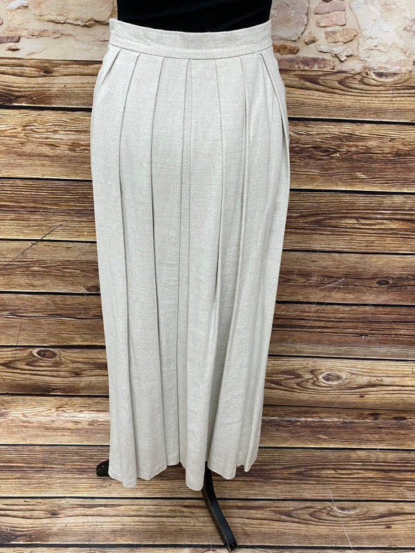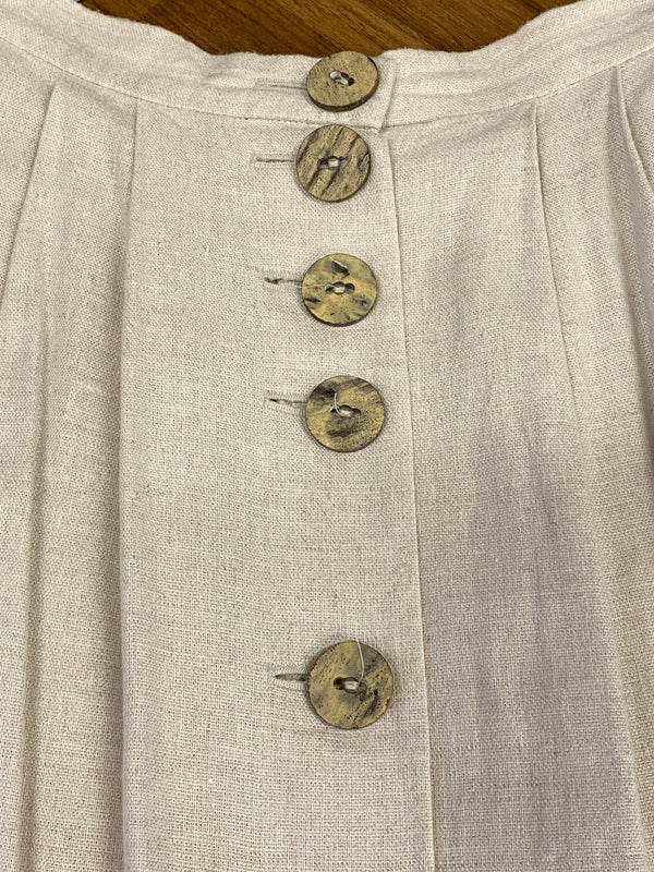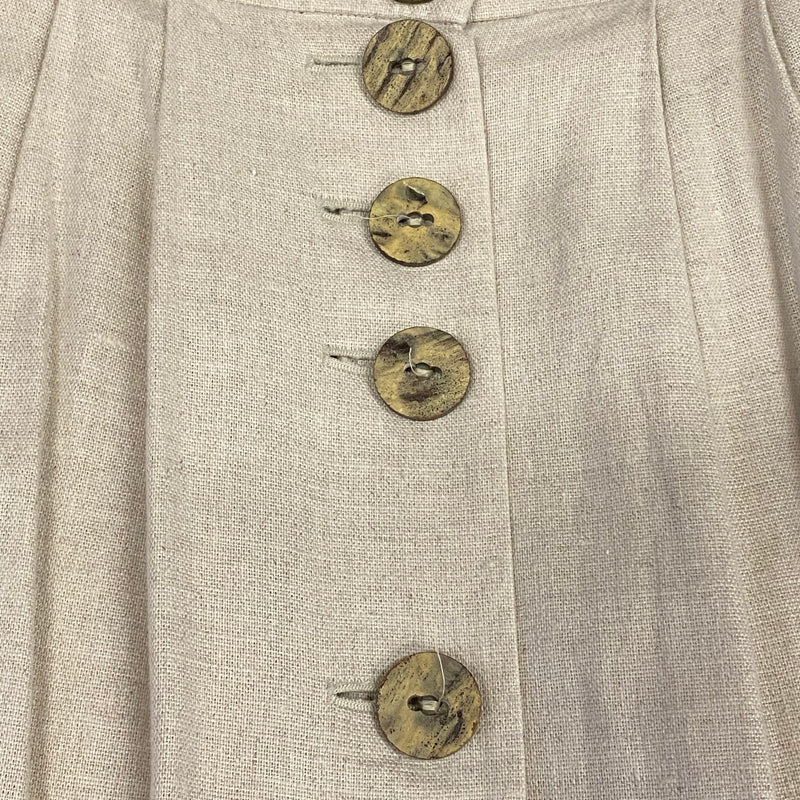 Klassischer Damenrock in Größe 38 aus einem Leinen-Mischgewebe in Beige. Der Rock ist wadenlang und verfügt über eine markante Knopfleiste auf der Vorderseite mit großen Knöpfen in Hornoptik. Zwei seitliche Eingrifftaschen sorgen für zusätzlichen Komfort.