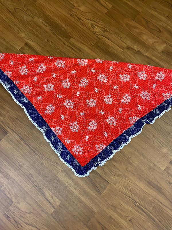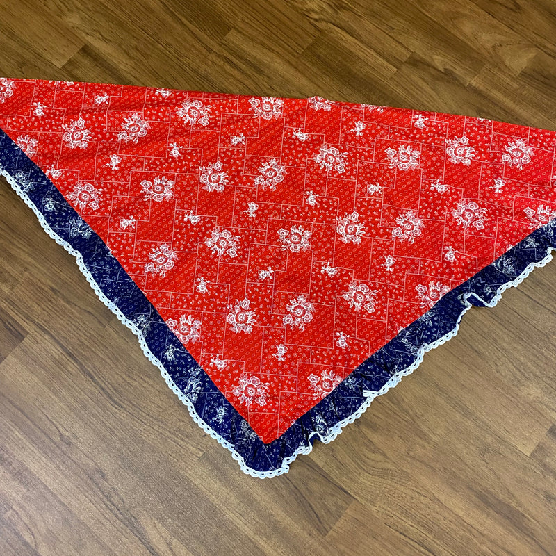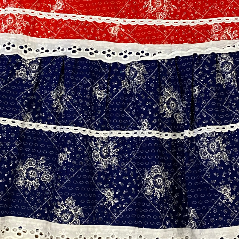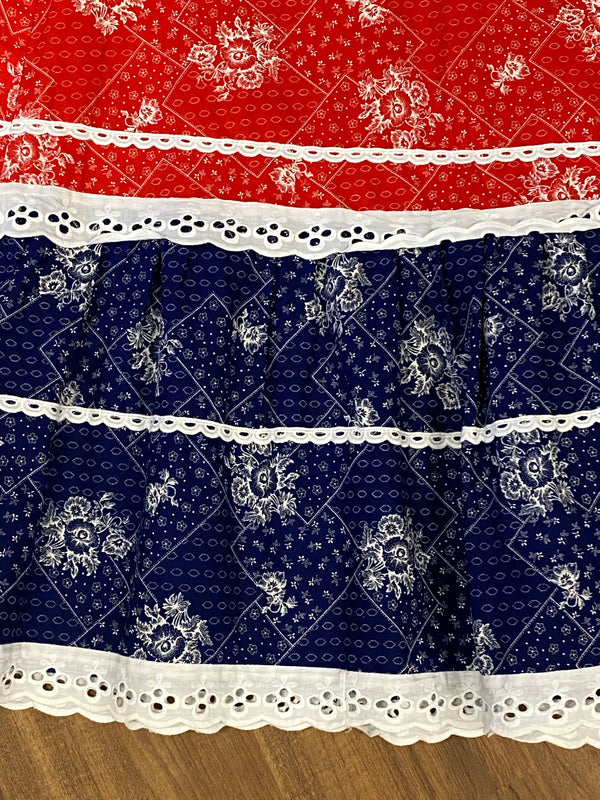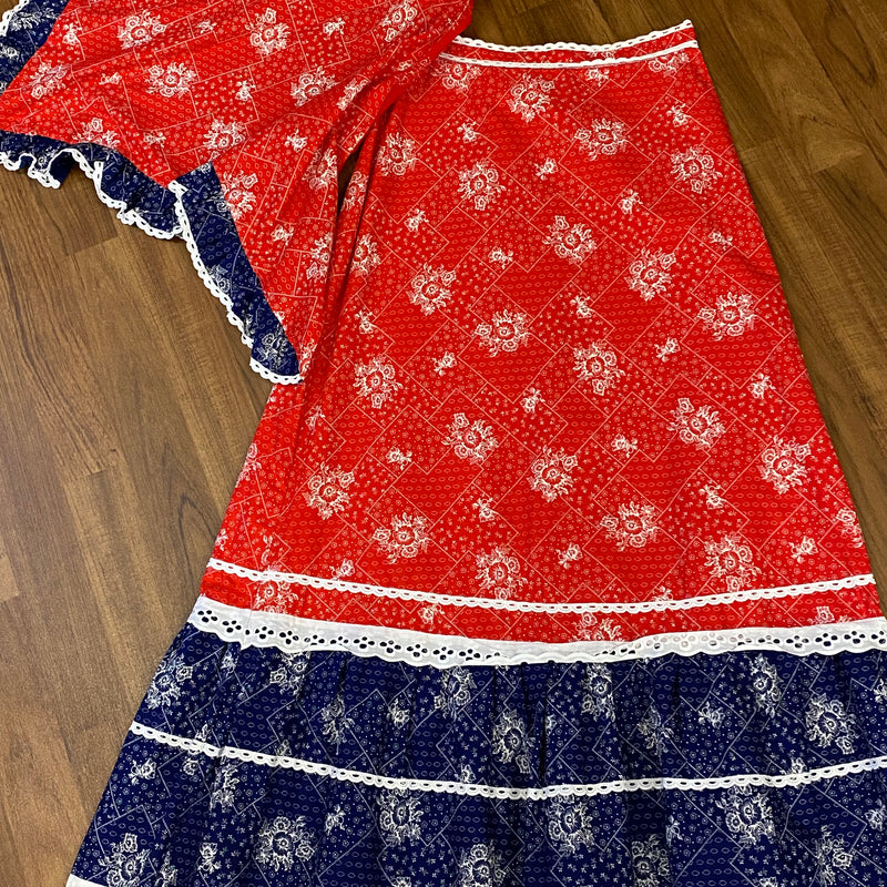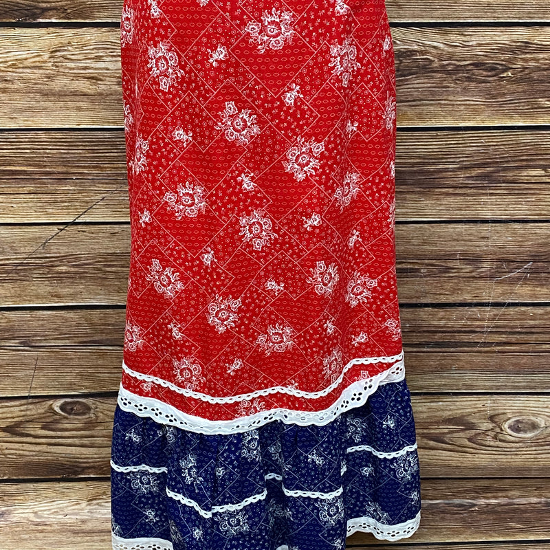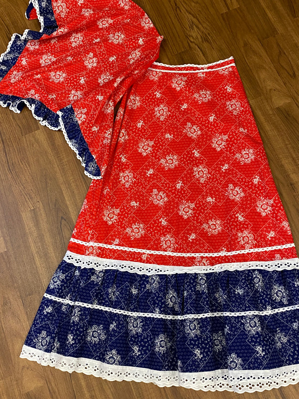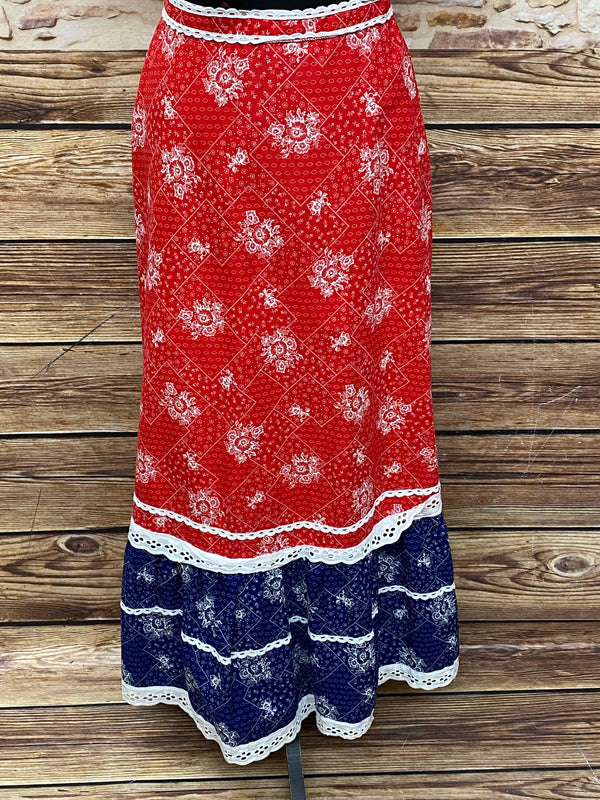 Hier seht ihr, einen edlen, raffinierten knöchellangen Baumwoll-Rock, Original aus den 1970er Jahren. Ganz chic und leger in Rot, weiß, blau. Der Rock ist in einem wunderschönen Vintage-Stil gearbeitet. Das tolle bei diesem Vintage-Rock, ist, das ein Dreieckstuch vom selben Stoff vorhanden ist. Das Schultertuch könnte als Oberteil umgearbeitet werden. Maschinenwaschbar. Ein Maxirock für junge und junggebliebene Damen, die Wert auf Nachhaltigkeit legen.