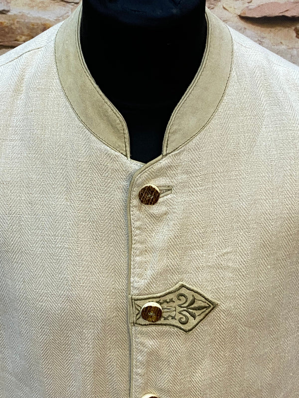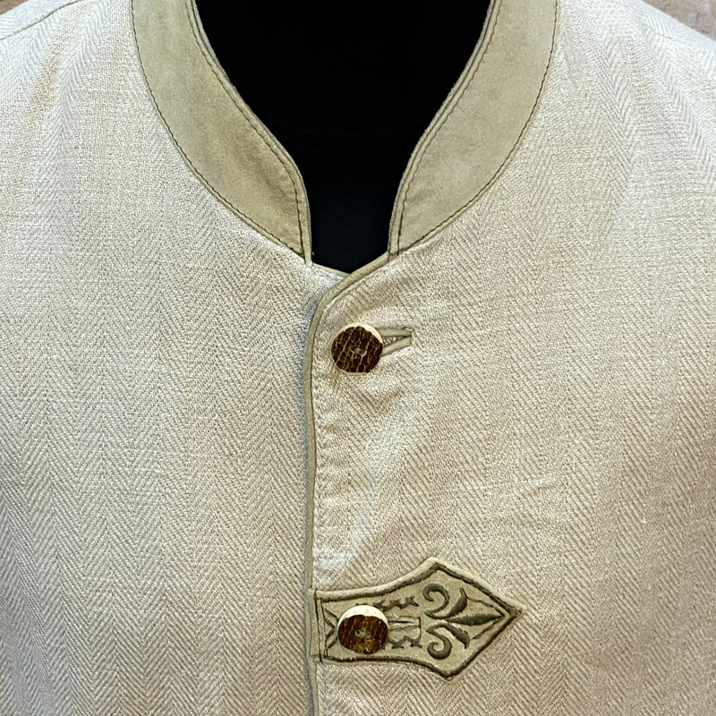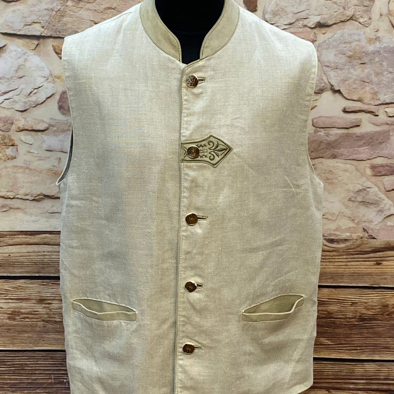 Eine elegante Trachtenweste in naturbeigem Ton, perfekt für traditionelle Outfits und festliche Anlässe. Der Stoff zeigt eine feine Fischgratstruktur, die der Weste eine hochwertige, leicht rustikale Optik verleiht.