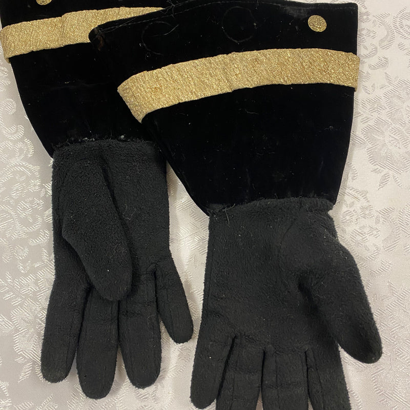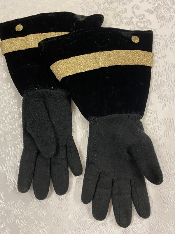 Außergewöhnliche Vintage Handschuhe in Schwarz mit dekorativer Samtstulpe und goldfarbenem Besatz. Die aufwendig gestalteten Manschetten mit Glitzerband und Zierknöpfen verleihen dem Paar einen deutlich theatralischen, historischen Look — ideal für Bühne, Kostüm, Reenactment oder festliche Inszenierungen.
