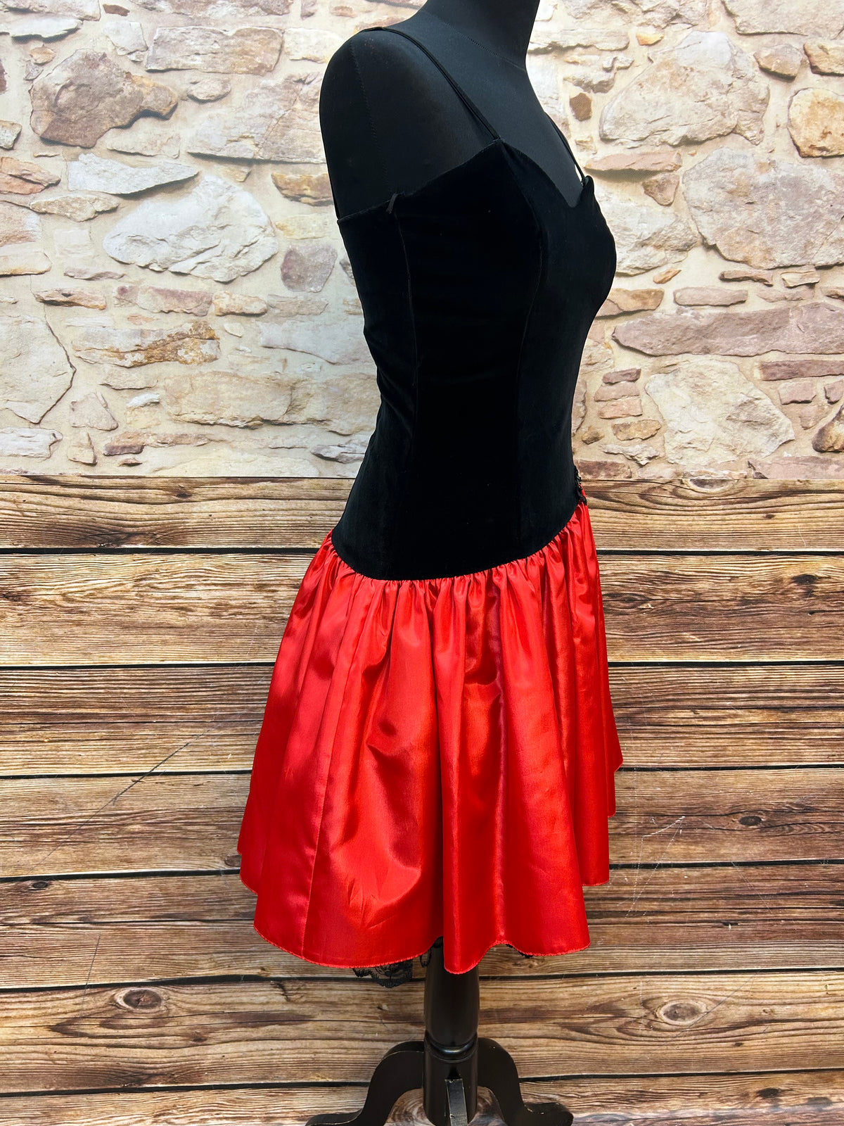 Tauche ein in die Welt des Glamours mit diesem exquisiten Vintage-Cocktailkleid, das klassische Eleganz mit modernem Flair verbindet. Das Oberteil aus luxuriösem schwarzen Samt betont deine Silhouette, während der ausgestellte Rock in leuchtendem Rot aus Satin für einen atemberaubenden Farbkontrast sorgt. Besondere Details wie die filigranen Pailletten-Applikationen am Übergang von Schwarz zu Rot fügen eine zarte Eleganz hinzu, die nicht übersehen werden kann.