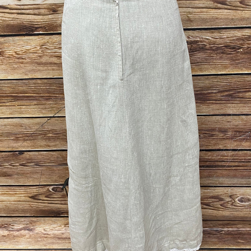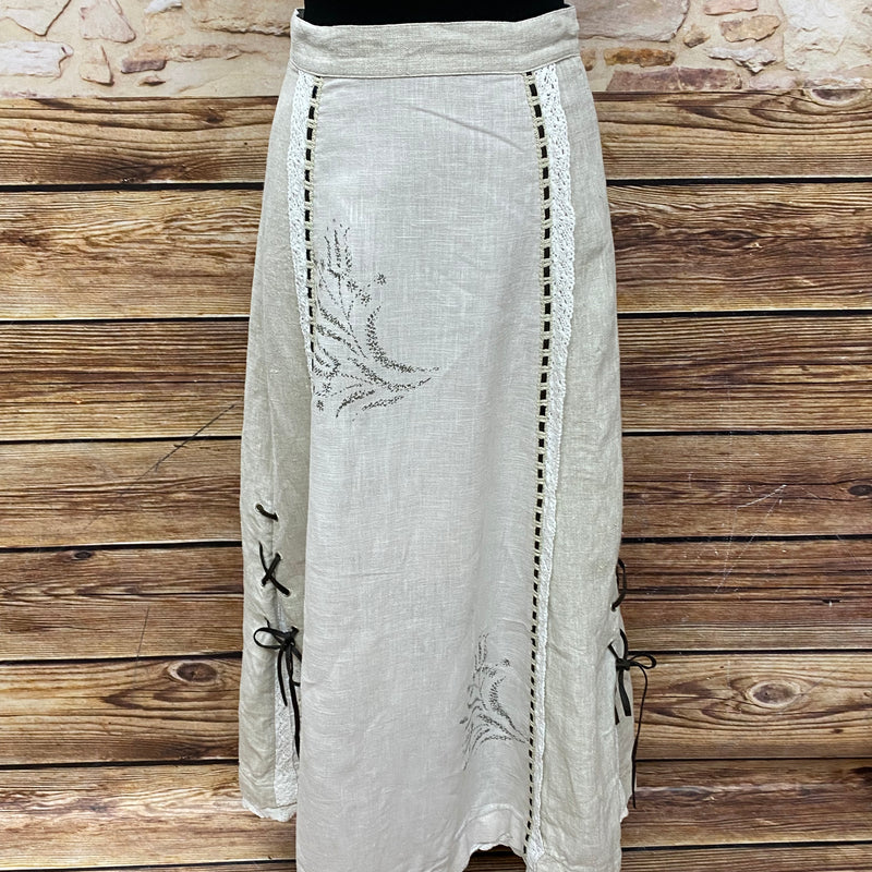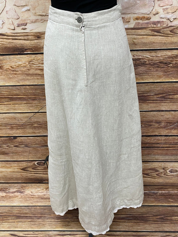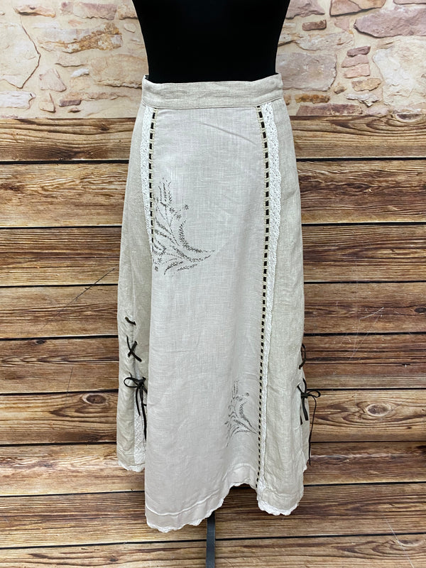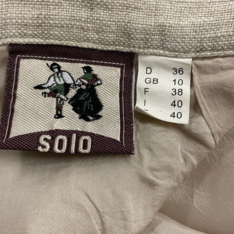 Verzaubere mit unserem Vintage Damen Trachtenrock von Solo, der traditionellen Landhausstil mit eleganten Details kombiniert. Dieser in Deutschland hergestellte Rock ist aus 100% Leinen gefertigt und in einem sanften Beige mit Creme-Tönen gehalten. Hervorgehoben wird der Rock durch zarte Klöppelspitze und stilvolle braune Applikationen, die ihm eine besondere Note verleihen.