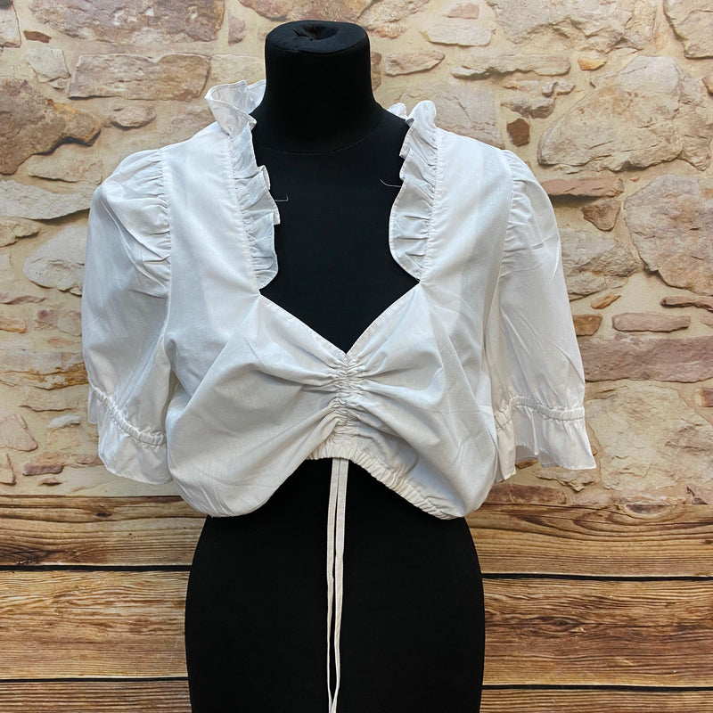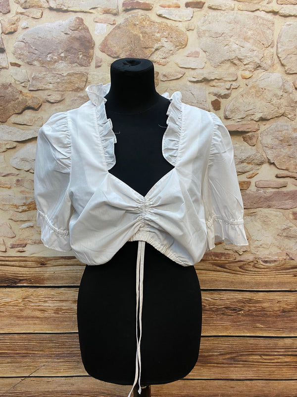 Wunderschöne Vintage Dirndlbluse von Edel Herz in Größe 44, die deutlich größer ausfällt (empfohlen bis ca. 46/48). Die Bluse besticht durch ihren Rüschenkragen, die halbtransparenten Puffärmel und die variable Raffung vorne, die das Dekolleté individuell formt. Der Stoffmix aus Polyester & Baumwolle sorgt für ein leichtes, angenehm tragbares Material – perfekt fürs Oktoberfest, Volksfeste oder traditionelle Outfits.