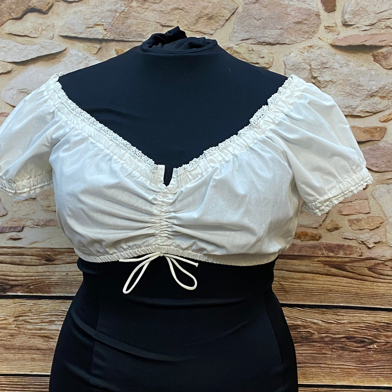 Wunderschöne Vintage-Dirndlbluse von MarJo, im beliebten Carmenstil für ein besonders feminines Dekolleté. Die Bluse besteht aus einem angenehmen Materialmix (65% Polyester / 35% Baumwolle) und trägt sich leicht und bequem. Zarte Spitzenbordüre an Ausschnitt und Ärmeln ergänzt den typischen Trachtenlook. Die Größe ist vom Hersteller als XL angegeben, sie fällt jedoch wie EU Größe 48 aus. Ideal für moderne und klassische Trachtenoutfits.