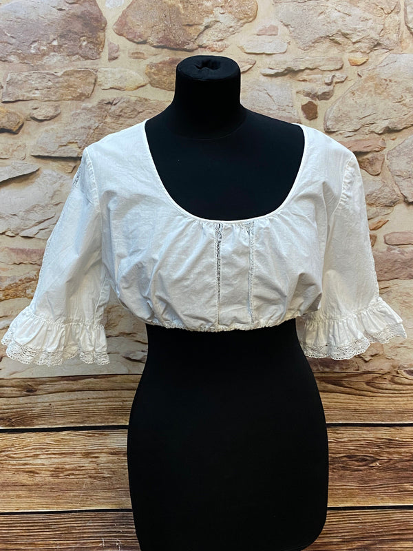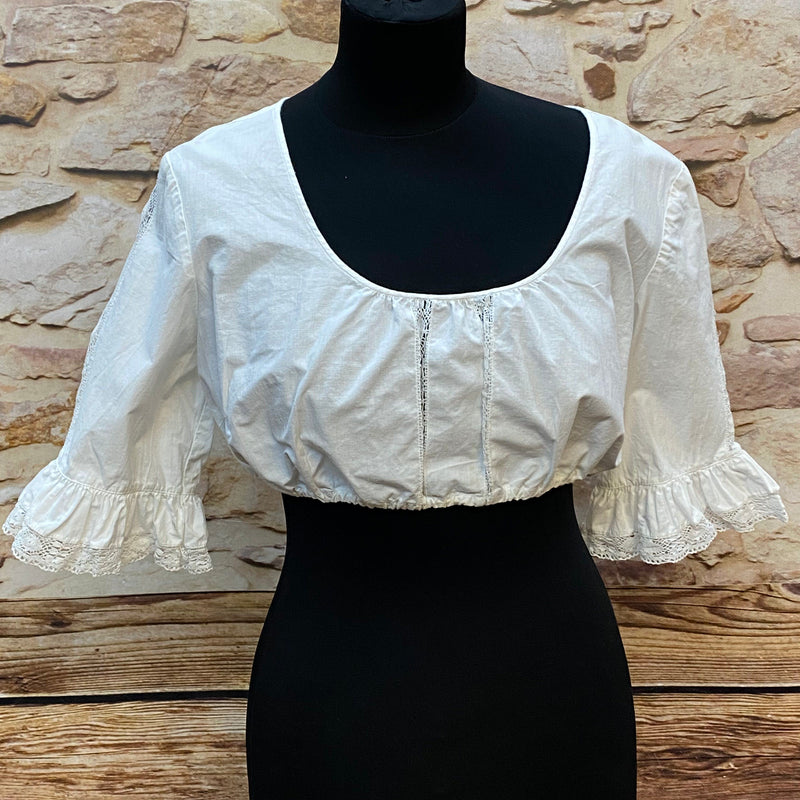 Wunderschöne Vintage Dirndlbluse in Größe 46 mit romantischen Spitzen-Details an den Ärmeln und zwei feinen Spitzenbahnen im Frontbereich. Typisch 80er/90er Look, leicht puffige Ärmel, elastischer Bund unten. Material wirkt wie Baumwolle (etikettlos, aber klar erkennbar). Angenehm zu tragen, perfekt für Trachtenlooks, Oktoberfest oder klassisch zum Vintage Dirndl. Schau auch mal hier bei unseren Trachten für Damen.