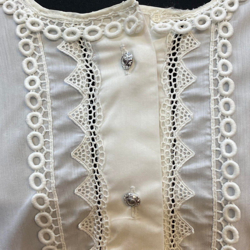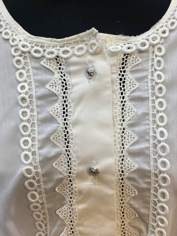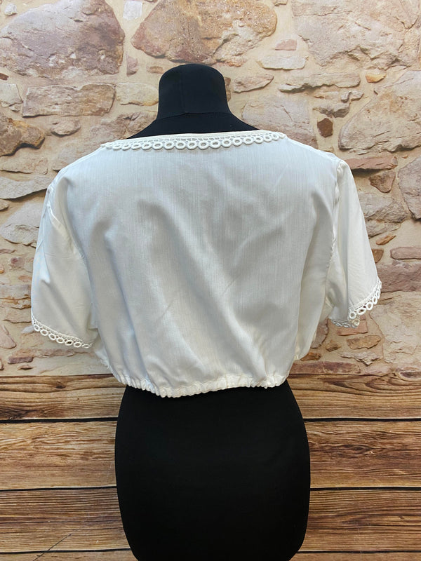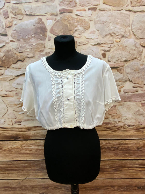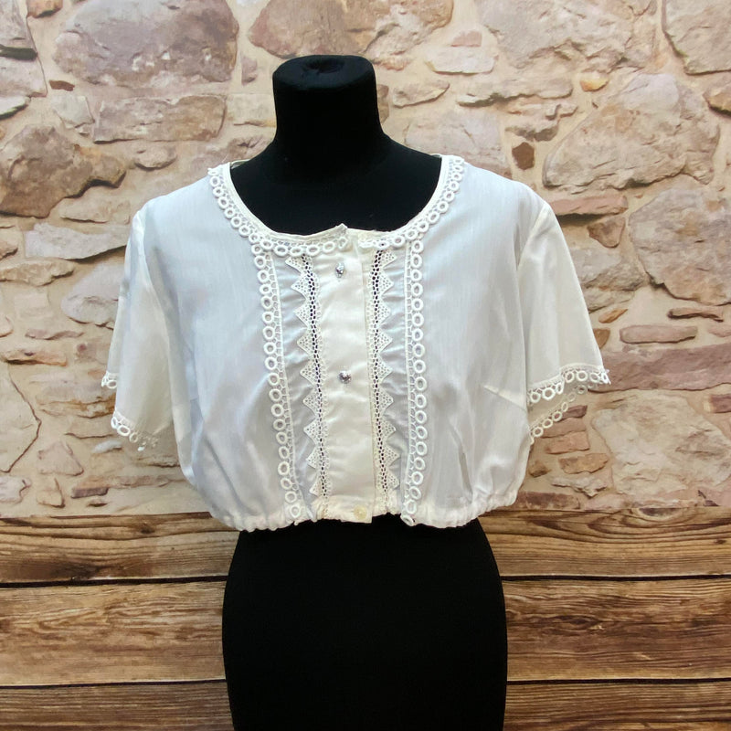 Zustand: sehr gut, vintage gepflegtGröße: 44Farbe: Weiß / NaturweißDetails: Häkelspitze, elastischer Bund, Silberknöpfe, kurzarm