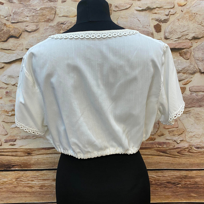 Diese wunderschöne Vintage-Dirndlbluse in Größe 44 überzeugt mit klassischer, traditioneller Optik und zarten Häkelspitzen-Details entlang des Ausschnitts, der Knopfleiste und den Ärmelabschlüssen. Die Bluse besitzt kurze, leicht puffige Ärmel, einen elastischen Saum und dekorative silberfarbene Knöpfe im Trachtenstil – perfekt für jedes Dirndl und ideal für Volksfest, Oktoberfest oder Trachten-Event.