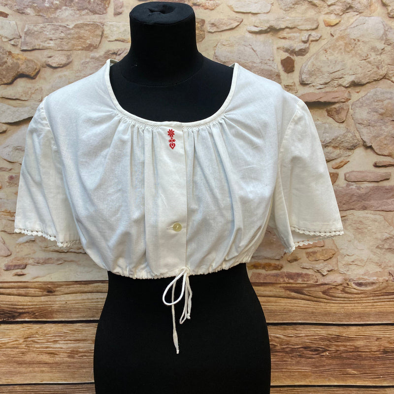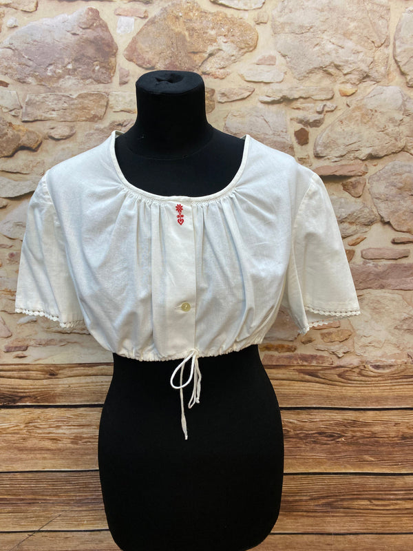 Wunderschöne Vintage-Dirndlbluse in Größe 44 mit klassischem, locker fallendem Schnitt. Die Bluse besteht aus leichtem, angenehm zu tragendem Material (Materialetikett fehlt, vermutlich Baumwollmischung, typisch für Blusen der 1980er–1990er Jahre).Besonderes Highlight ist die rote Kreuzstich-Stickerei im Brustbereich, die der Bluse einen liebevollen, traditionellen Akzent verleiht. Elastischer Bund mit Bindeband, kurze Ärmel mit zarter Kante – perfekt für traditionelle Outfits, Volksfeste und Trachtenlooks.