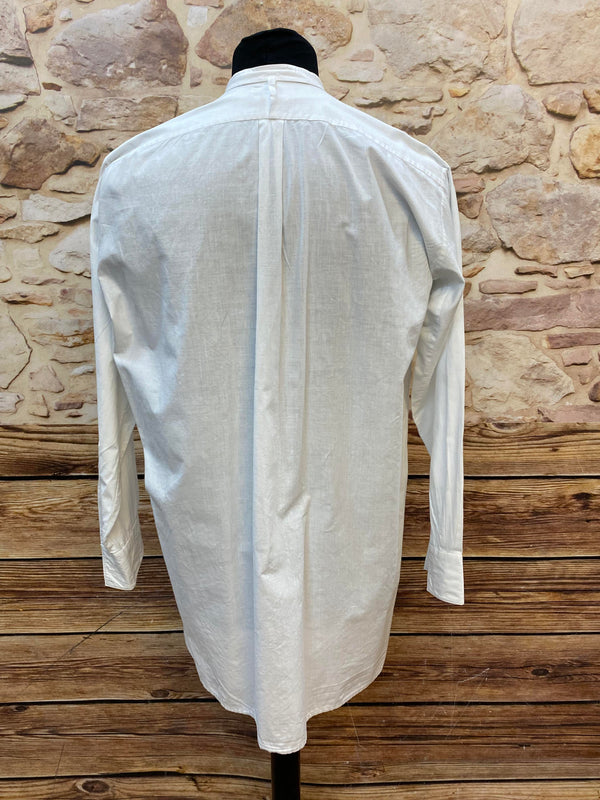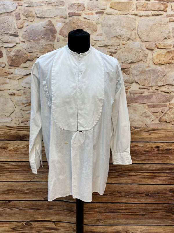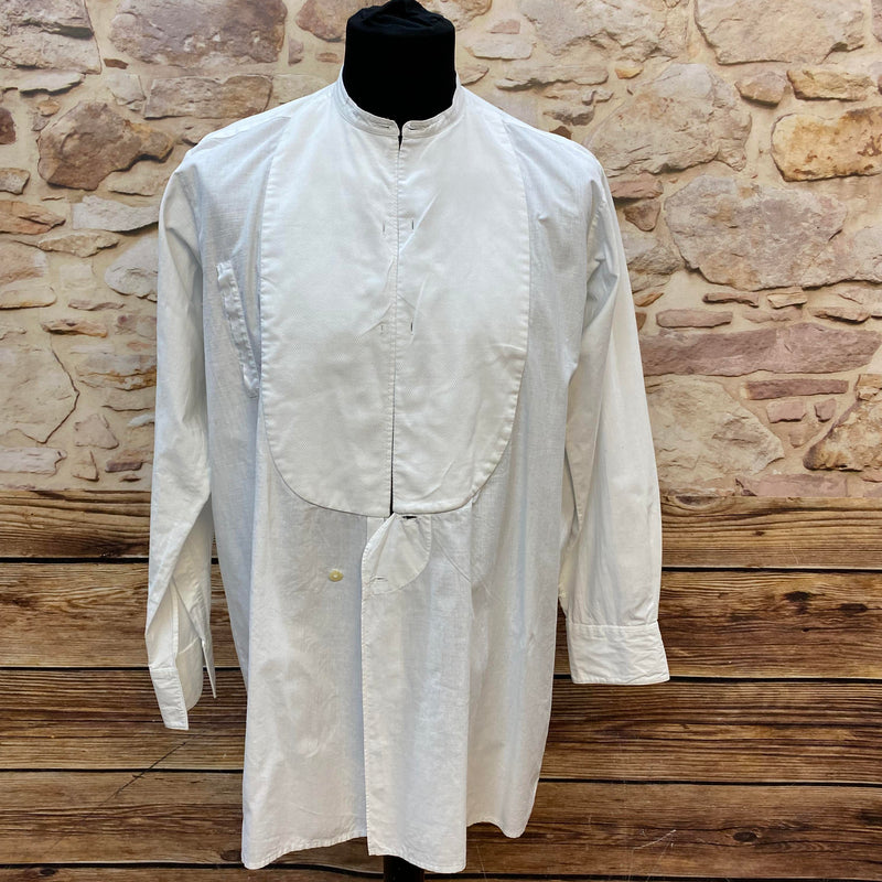Ein klassisches Vintage-Frackhemd in Weiß – perfekt für historische Kostüme, Bühne, Theater, Reenactment oder als besonderes Sammlerstück.Das Hemd besitzt einen schlichten Stehkragen, eine lange, lockere Passform und die charakteristische verstärkte Brustpartie, wie sie bei traditionellen Frackhemden üblich ist.