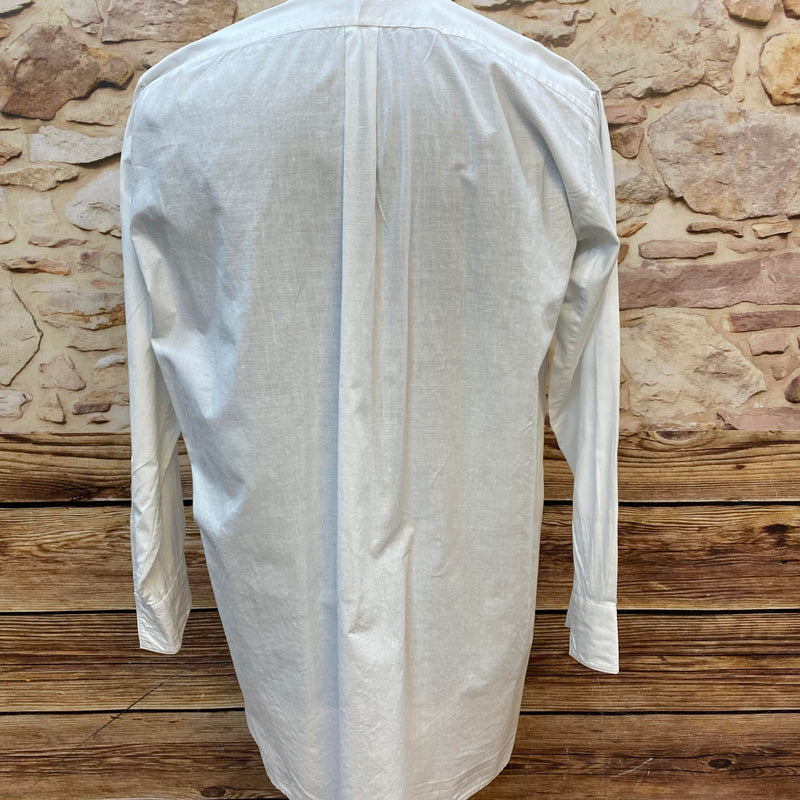 Es lässt sich vorne teilweise knöpfen, hat lange Manschettenärmel und ist insgesamt länger geschnitten als moderne Hemden.Auf der Vorderseite befindet sich eine kleine beschädigte Stelle, die für das Alter typisch ist und den authentischen Vintage-Charakter unterstreicht.Trotzdem ist das Hemd insgesamt in gutem, tragbarem Zustand.