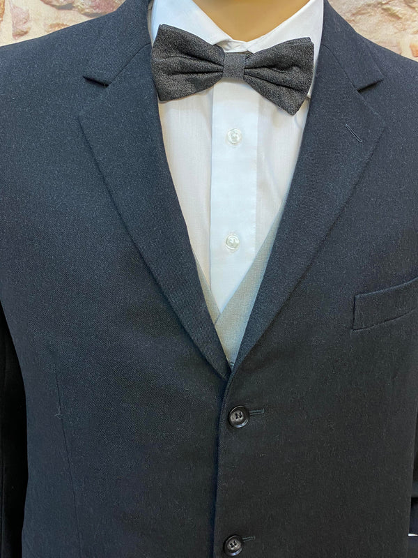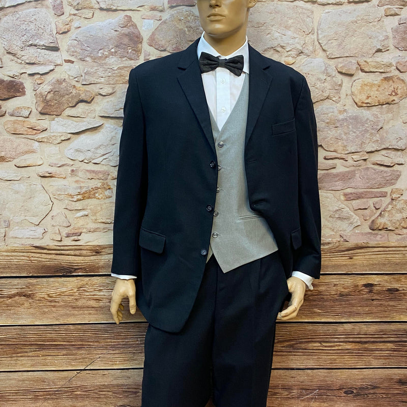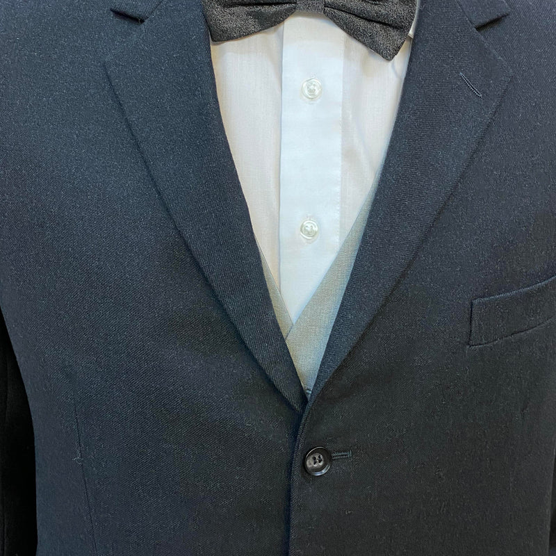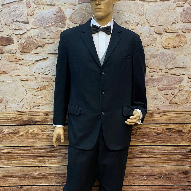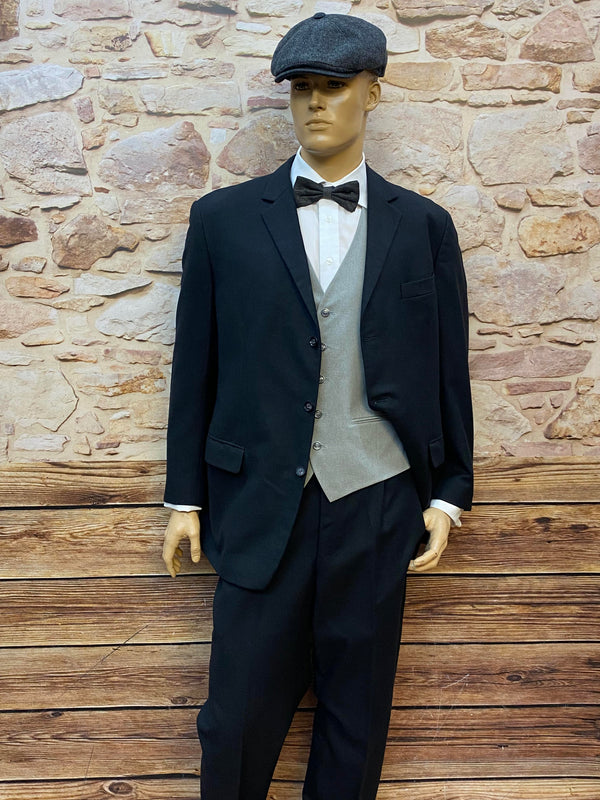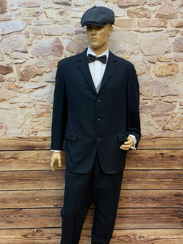 Zeitlos eleganter Vintage Herrenanzug aus reiner Schurwolle in klassischem Schwarz. Dieses stilvolle Ensemble besteht aus Sakko, Hose, Weste, Hemd, Fliege, Manschettenknöpfe und Schiebermütze und eignet sich perfekt für formelle Anlässe, Hochzeiten, Abendveranstaltungen oder elegante Vintage-Events.