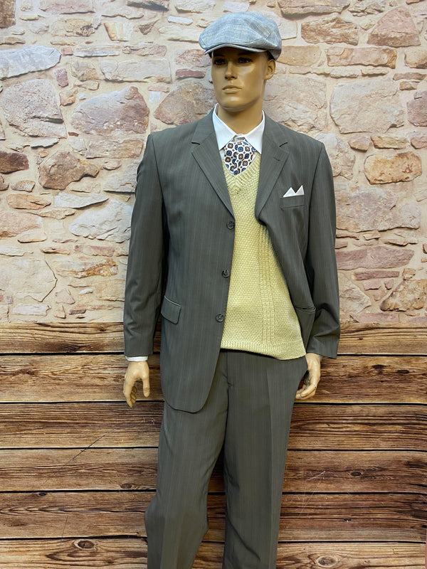Elegantes Vintage Herren Outfit im klassischen 20er Jahre Stil mit Nadelstreifenanzug, Strick-Pullunder und Schiebermütze. Dieses stilvolle Ensemble verkörpert zeitlose Herrenmode mit britischem Flair und erinnert an die Mode der Goldenen Zwanziger sowie an den beliebten Peaky-Blinders-Look.