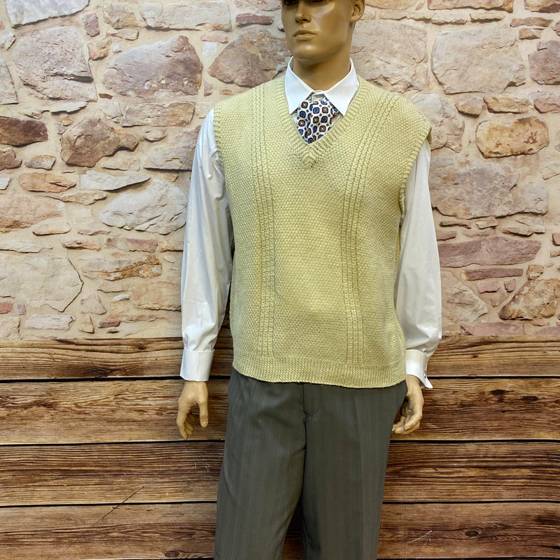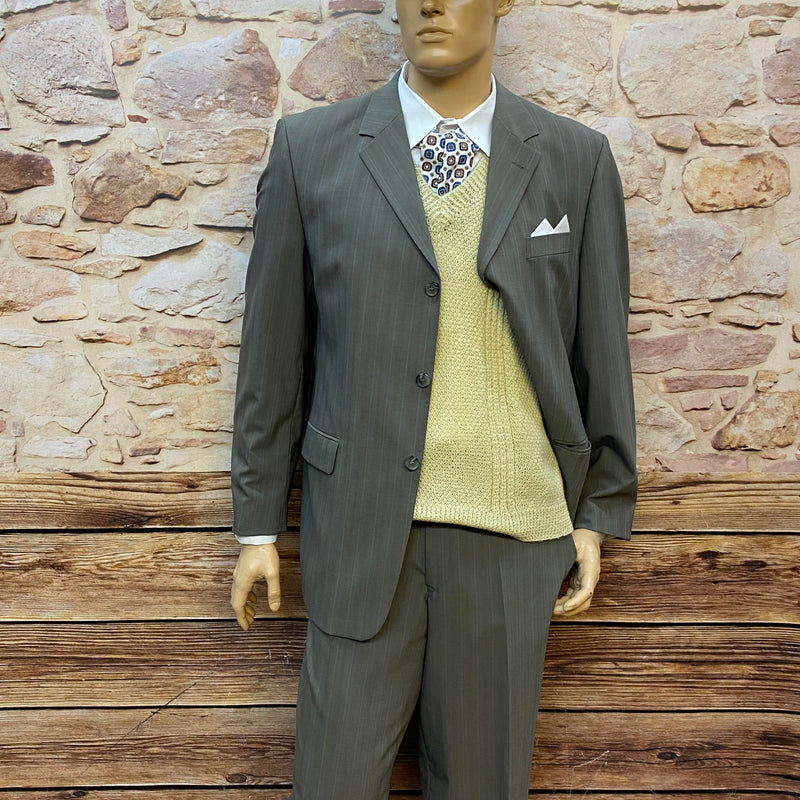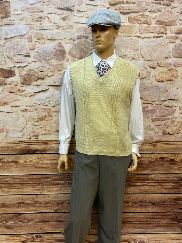 Der hochwertige Anzug aus Schurwollmischung wird durch den hellen Strickpullunder, Hemd und gemusterte Krawatte perfekt ergänzt. Ideal für Hochzeiten, Vintage-Events, Mottopartys, Theater, Fotoshootings oder stilvolle Auftritte mit Retro-Charakter.