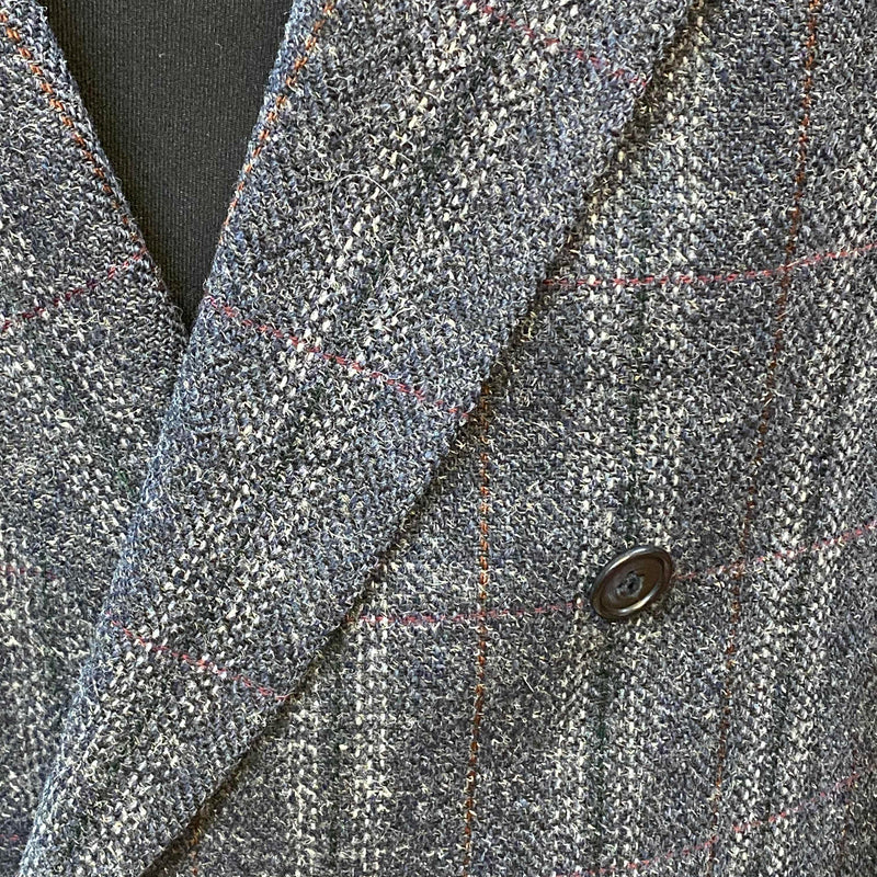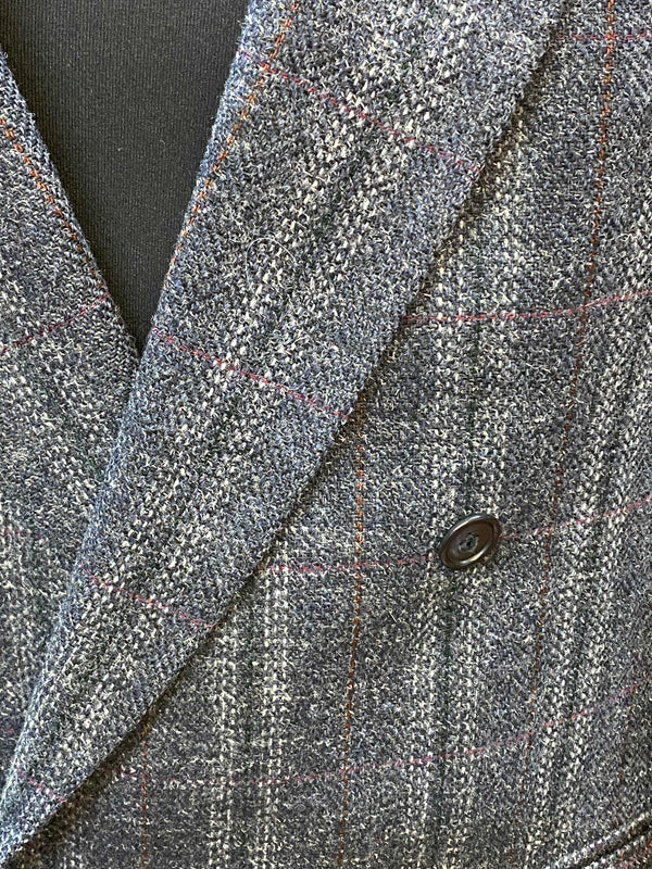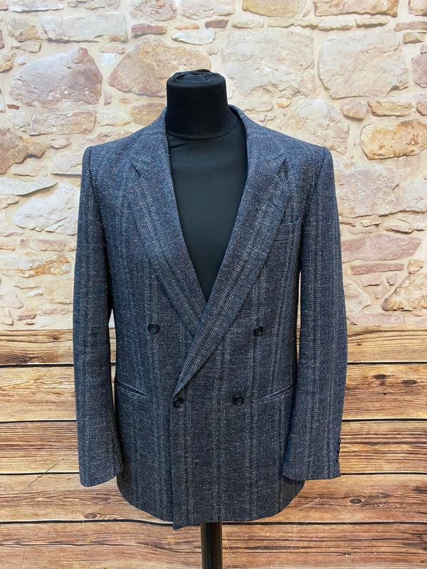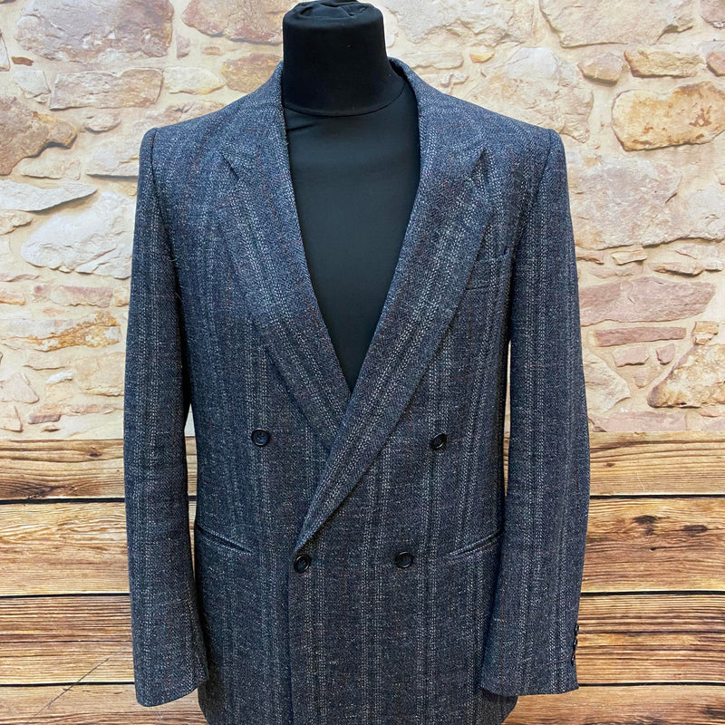 Edles Vintage-Doppelreiher-Sakko aus reiner Schurwolle, Spezialanfertigung für Dyckhoff. Hochwertige Tweed-Optik mit feiner Linienstruktur in Grau, Blau und dezenten Farbakzenten. Klassisch, zeitlos und selten – perfekt für Liebhaber authentischer Vintage-Mode.