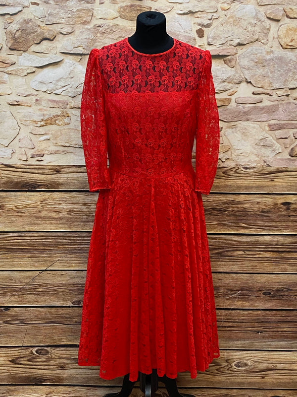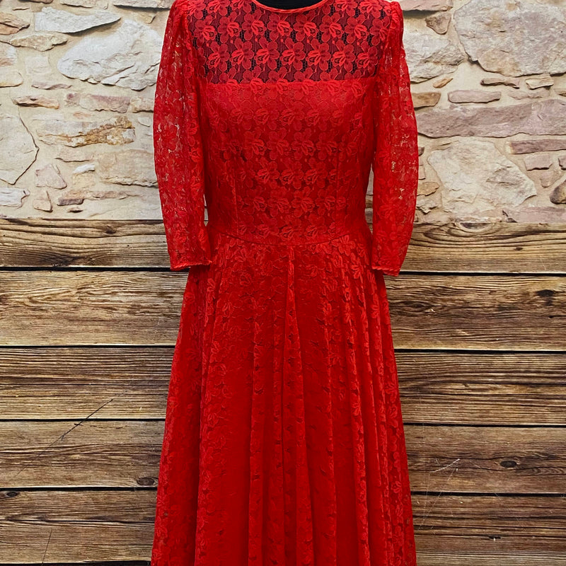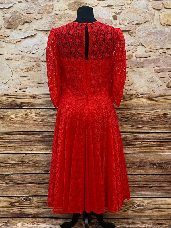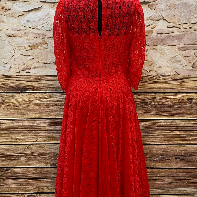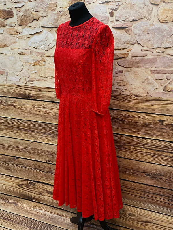 Ausdrucksstarkes rotes Vintage-Spitzenkleid aus den 1980er Jahren – ideal als elegantes Theaterkostüm für Bühne, Film oder historische Inszenierungen.