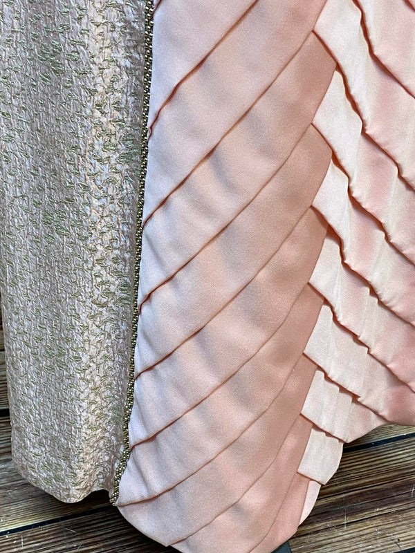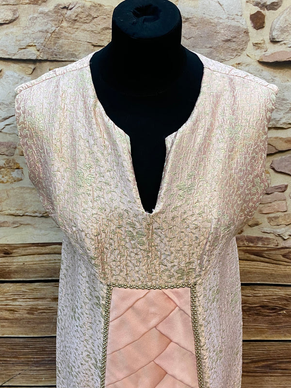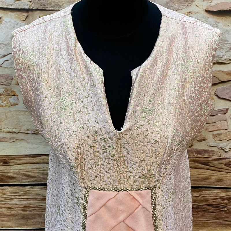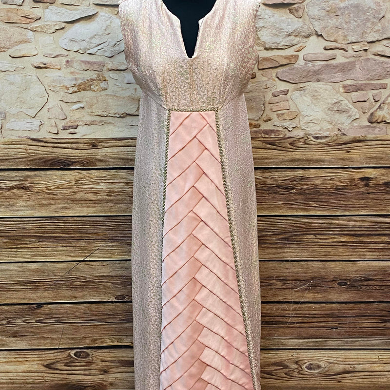 Dieses elegante Vintage Abendkleid aus den 1960er Jahren vereint klassische Theaterästhetik mit raffinierter Verarbeitung. Das lange Maxikleid in zartem Rosé mit goldenen Brokatdetails wirkt besonders edel und erinnert an historische Bühnenkostüme oder stilvolle Abendgarderobe vergangener Jahrzehnte.
