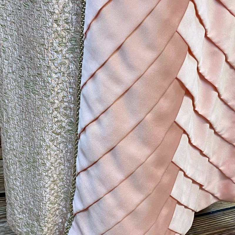 Der besondere Blickfang ist der dekorative Mittelstreifen aus plissiertem Stoff, der dem Kleid eine elegante Linienführung verleiht und die Silhouette optisch streckt. Der strukturierte Stoff mit eingewebtem Muster unterstreicht den hochwertigen Charakter des Kleides und verleiht ihm eine luxuriöse Ausstrahlung.
