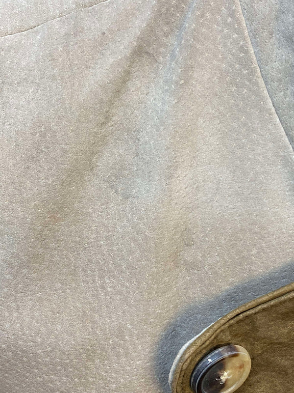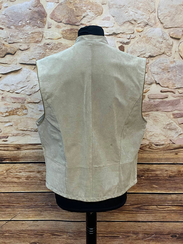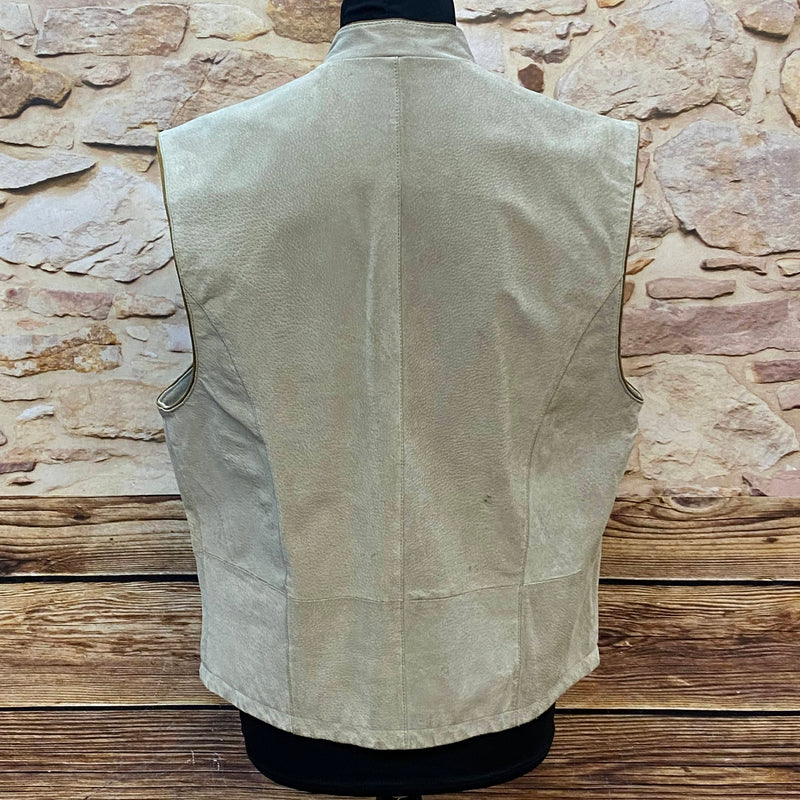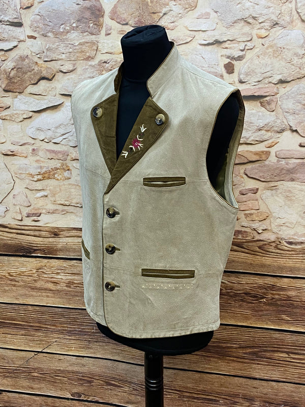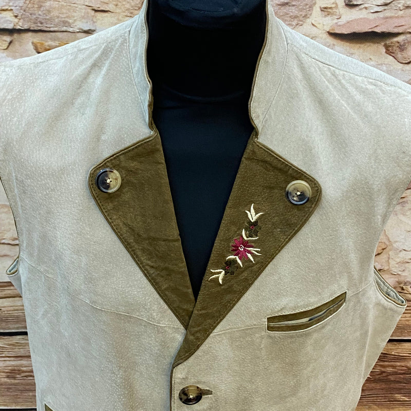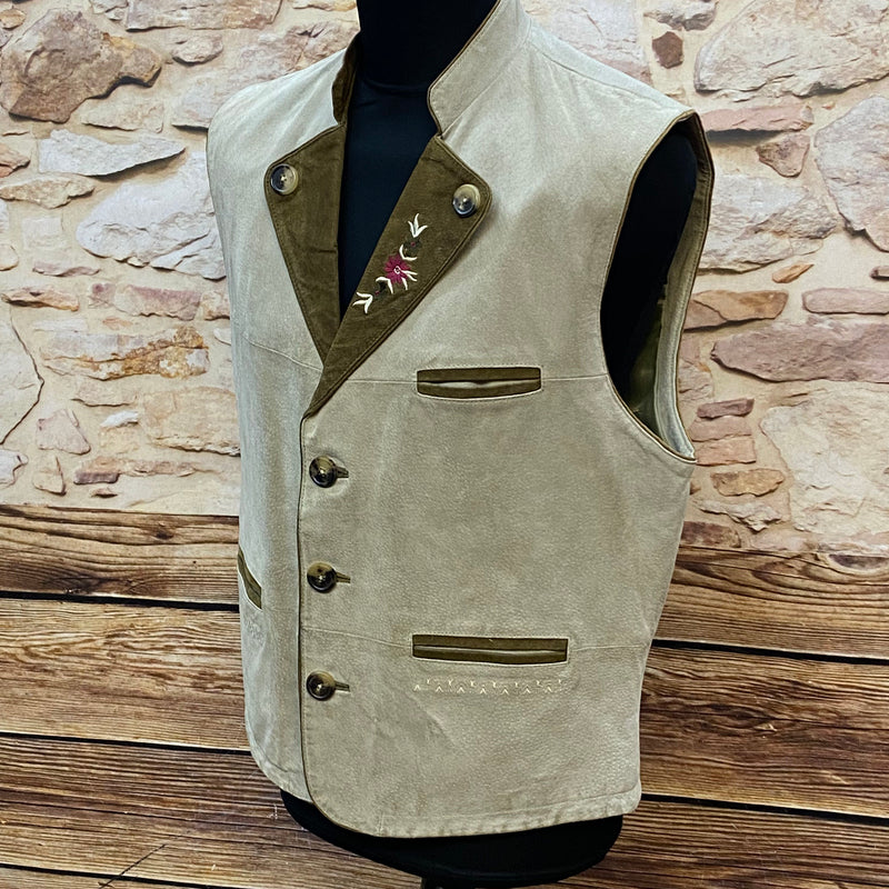 Klassische Vintage Trachtenweste aus echtem Leder in hellem Beige mit olivfarbenen Kontrasten. Besonders schön ist die dezente florale Stickerei im Brustbereich, die der Weste eine elegante, traditionelle Note verleiht. Die typischen Trachtenknöpfe und die feine Verarbeitung machen dieses Stück zu einem stilvollen Begleiter für viele Anlässe.