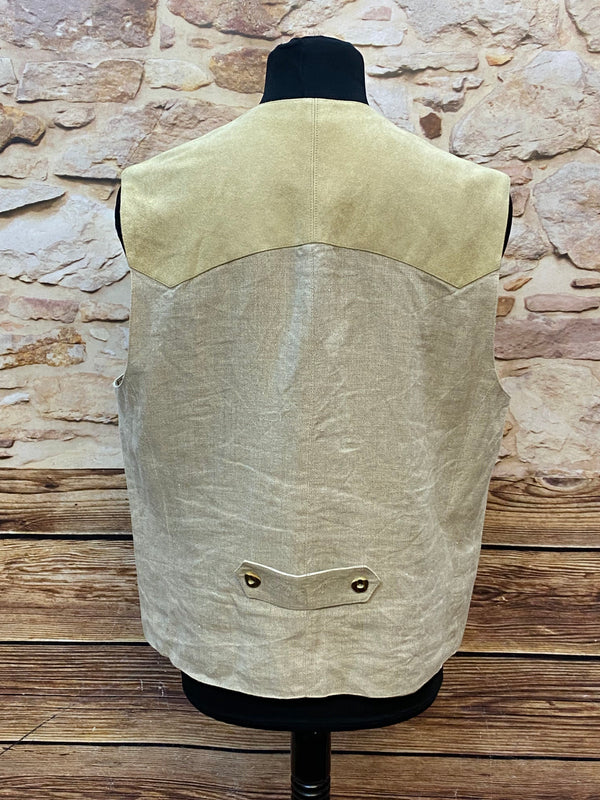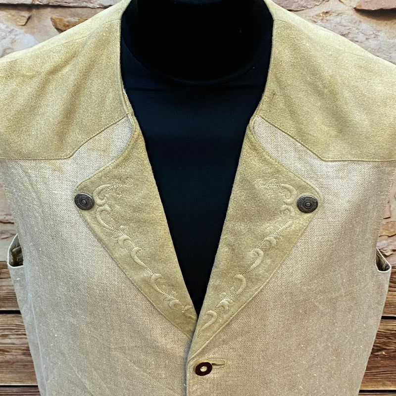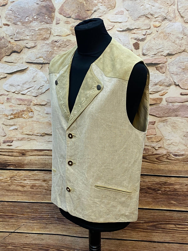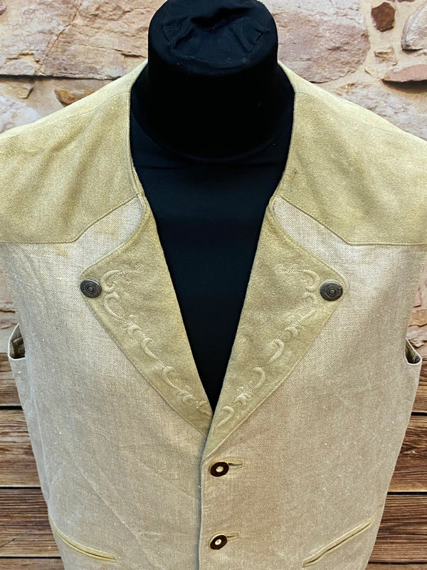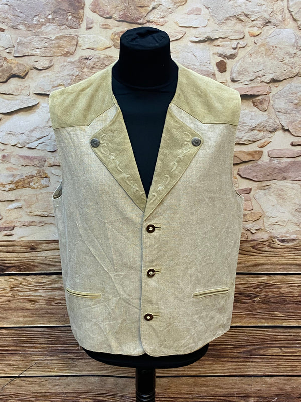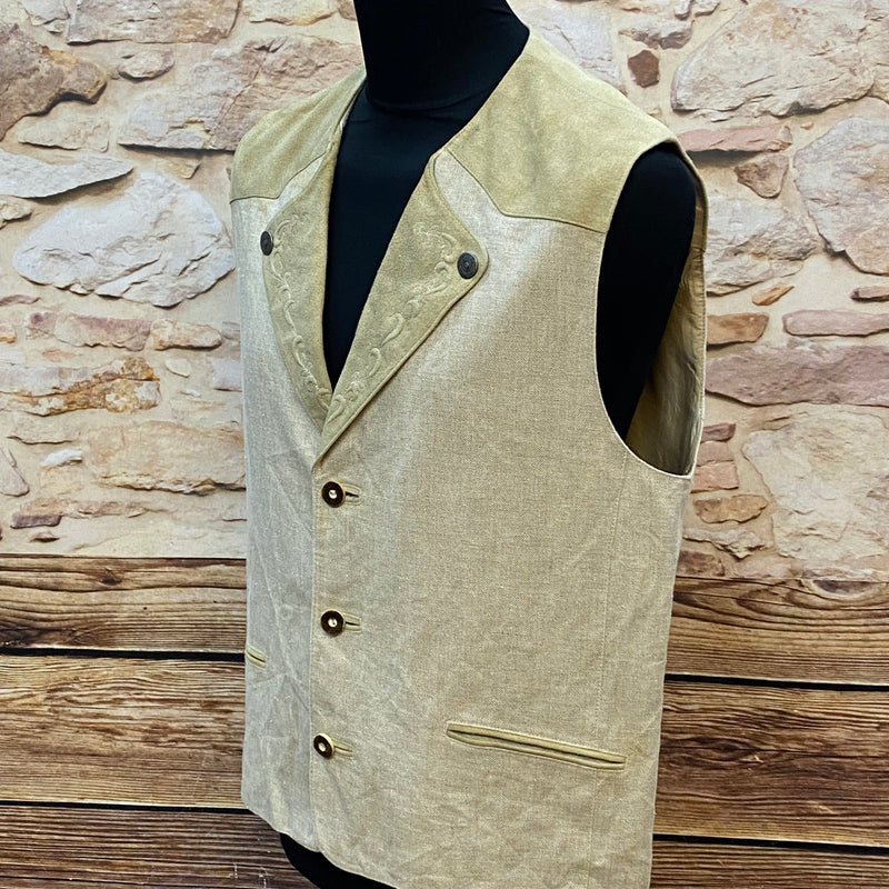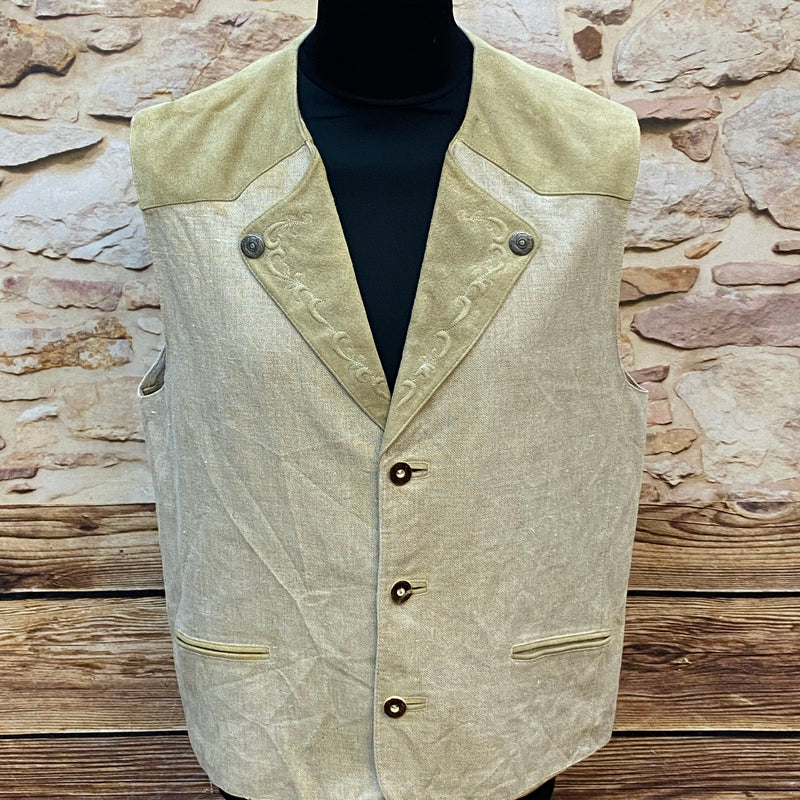 Klassische Vintage Trachtenweste der Marke „Distler Original“ in hellem Beige mit stilvollen Lederdetails an Schulter und Kragen. Die Kombination aus Leinen und Leder verleiht der Weste einen besonders hochwertigen und traditionellen Look. Dezente Stickereien am Revers sowie klassische Trachtenknöpfe runden das Design ab.