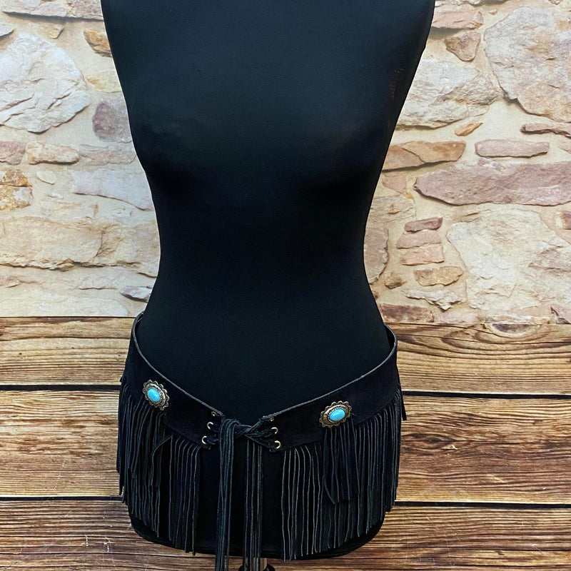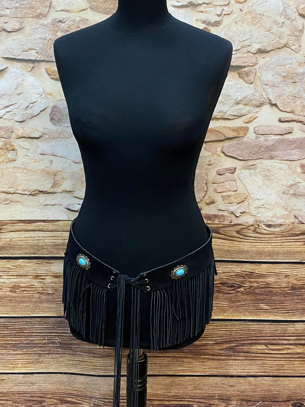 Der Gürtel wird vorne geschnürt und lässt sich dadurch flexibel anpassen. Die langen Fransen sorgen für eine dynamische Silhouette und unterstreichen den typischen Western- und Boho-Stil. Die ornamentalen Metallapplikationen mit türkisfarbenen Cabochons verleihen dem Stück eine authentische Vintage-Ausstrahlung.
