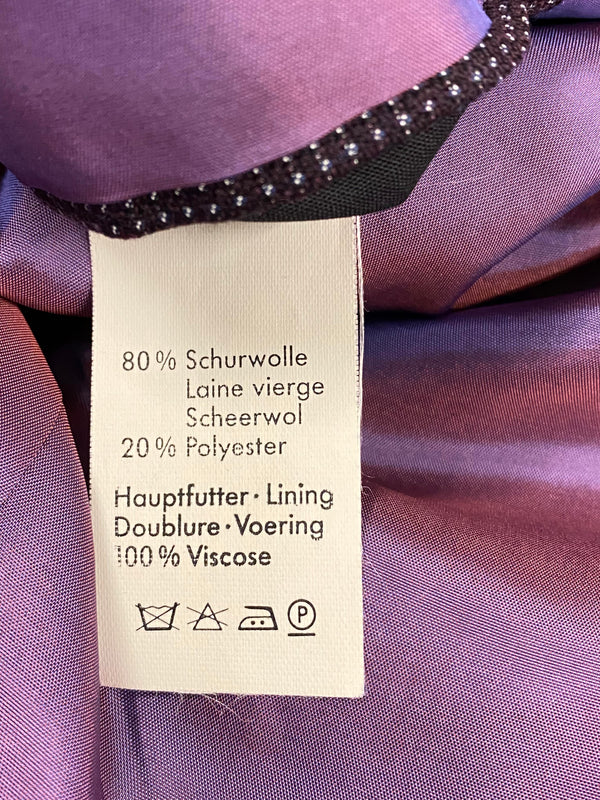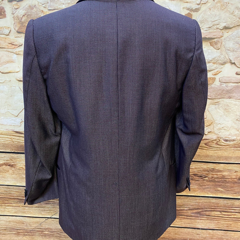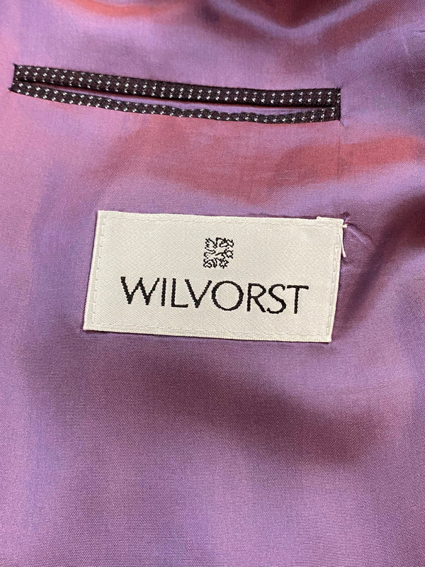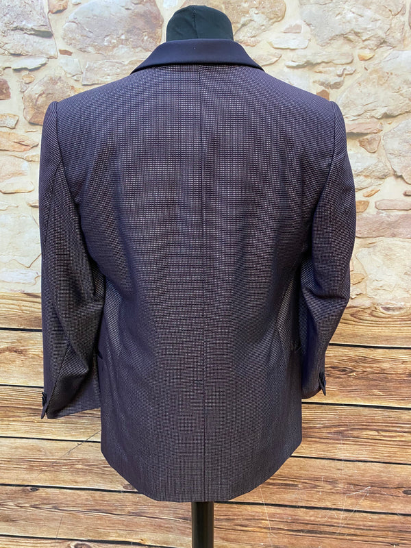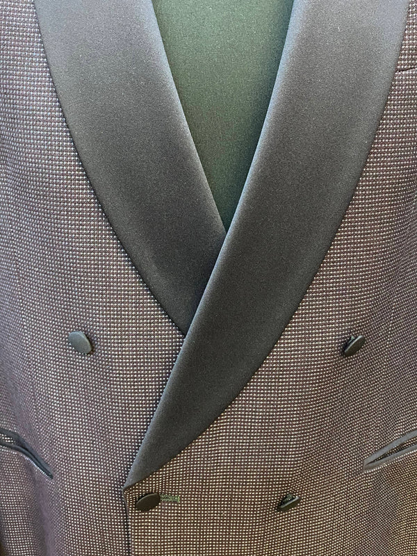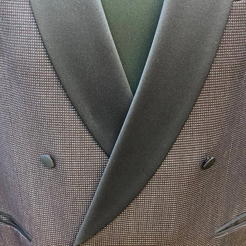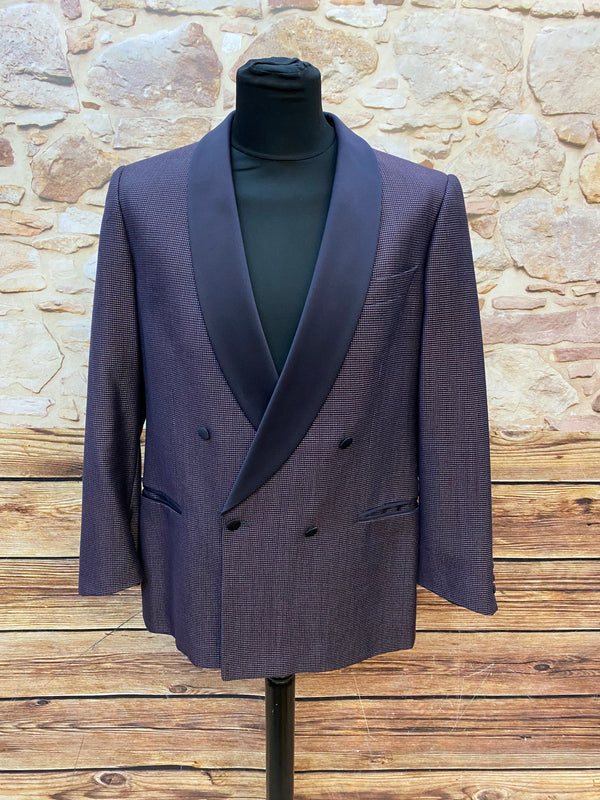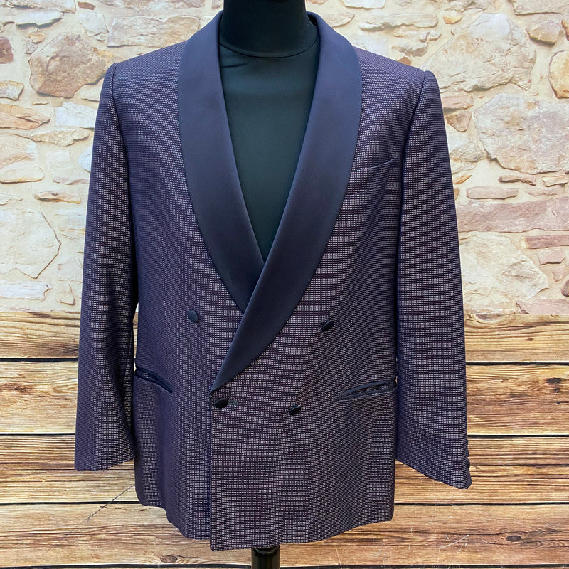 Diese elegante Vintage-Smokingsjacke von Wilvorst steht für zeitlosen Stil und höchste Schneiderkunst. Der feine Stoff aus Schurwolle mit edlem Glanz, kombiniert mit dem tiefschwarzen Satin-Schalkragen, verleiht diesem Sakko eine luxuriöse Ausstrahlung – perfekt für festliche Anlässe, Galas oder Hochzeiten. Die doppelte Knopfreihe und das strukturierte Gewebe unterstreichen den hochwertigen Charakter.